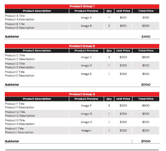 is it possible to add product group title for products and subtotal each group, this is how i want to format my templates: