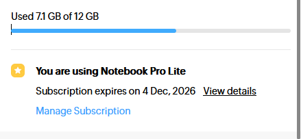 In the Zoho Notebook webapp, when I click on my profile with subscription details, it says that I have used 7,1 GB of 12 GB storage space.