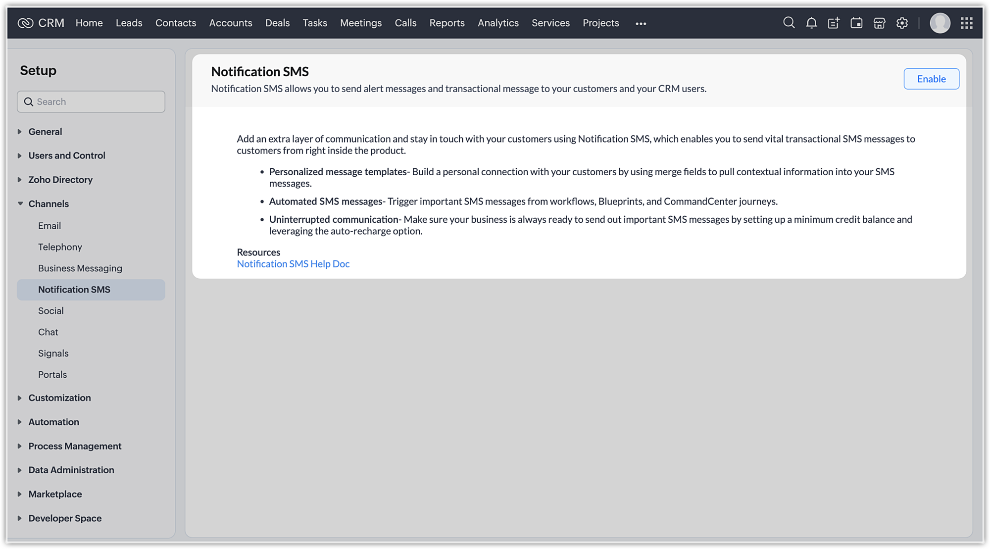 You can enable automatic notifications via SMS with the help of workflow rules as reminders for tasks, meetings, calls, and so on. You can configure rules and select SMS notifications as an instant action.
