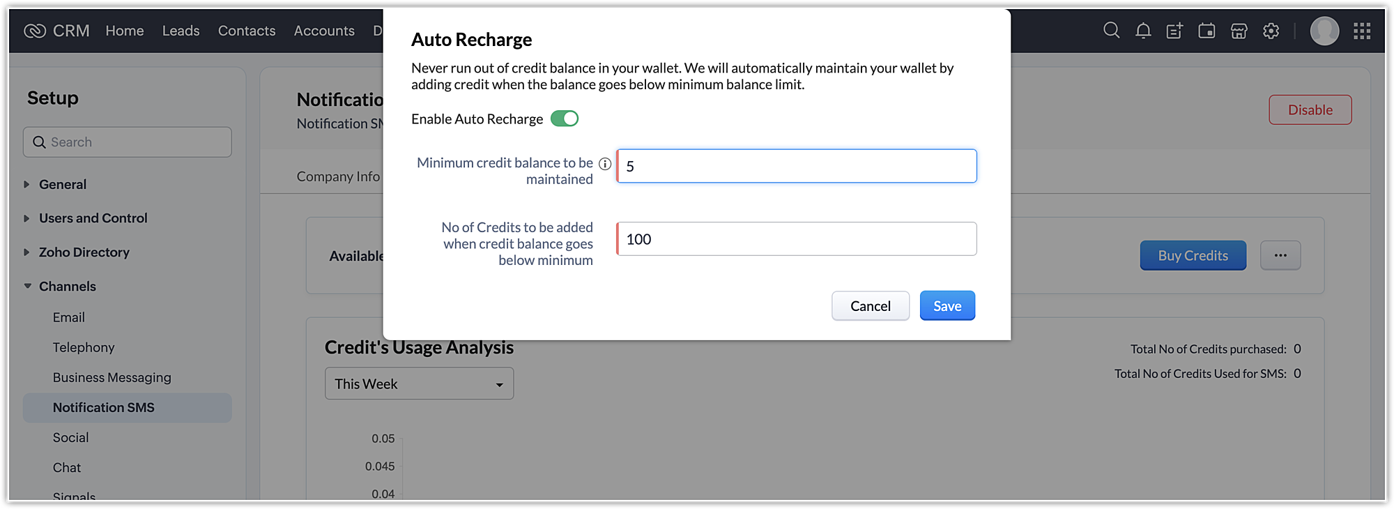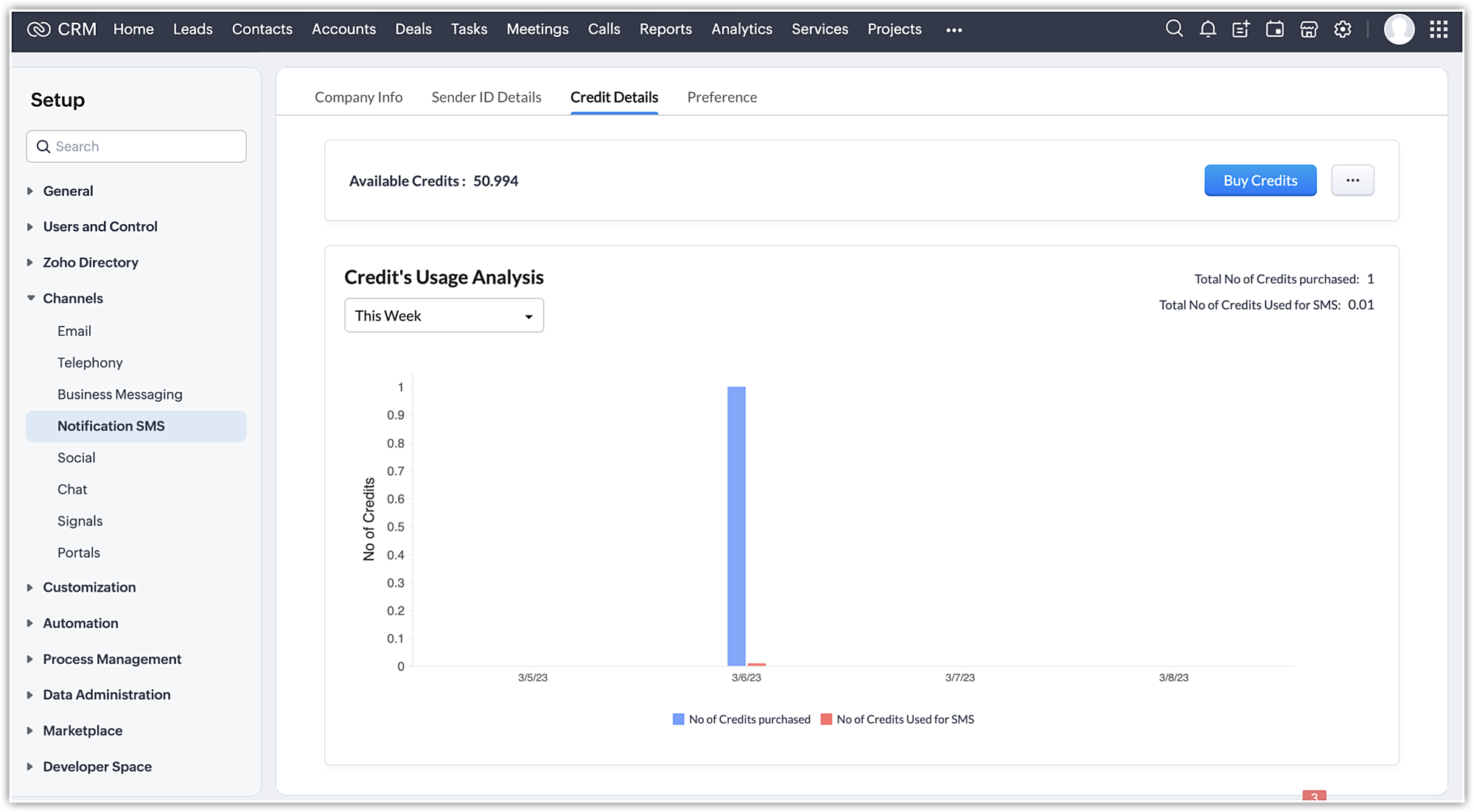 Upon enabling the Notification SMS feature with company info and sender ID info, customers will be redirected to the Credit Details tab. Here, they can view details of their credits, like the available balance and the credit usage analysis, as well as buy new credits, set up auto-recharge, or see credit purchase history.