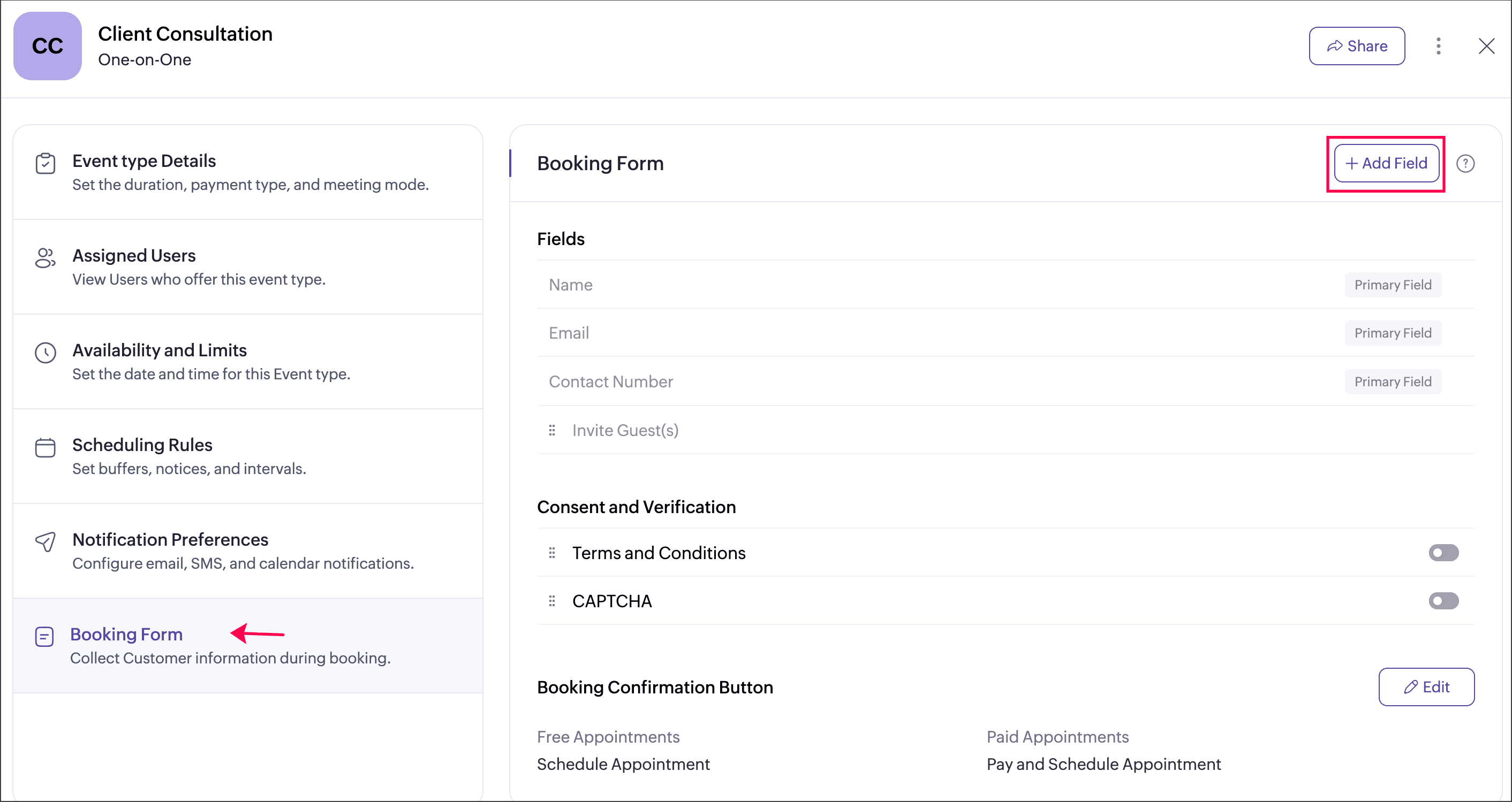Here, you can add and manage the fields that will be used across all event types, ensuring a consistent structure for collecting customer information. You can also add additional fields specific to individual event types by configuring custom fields in the booking form under each event type. This helps capture both common and event-specific information as needed.