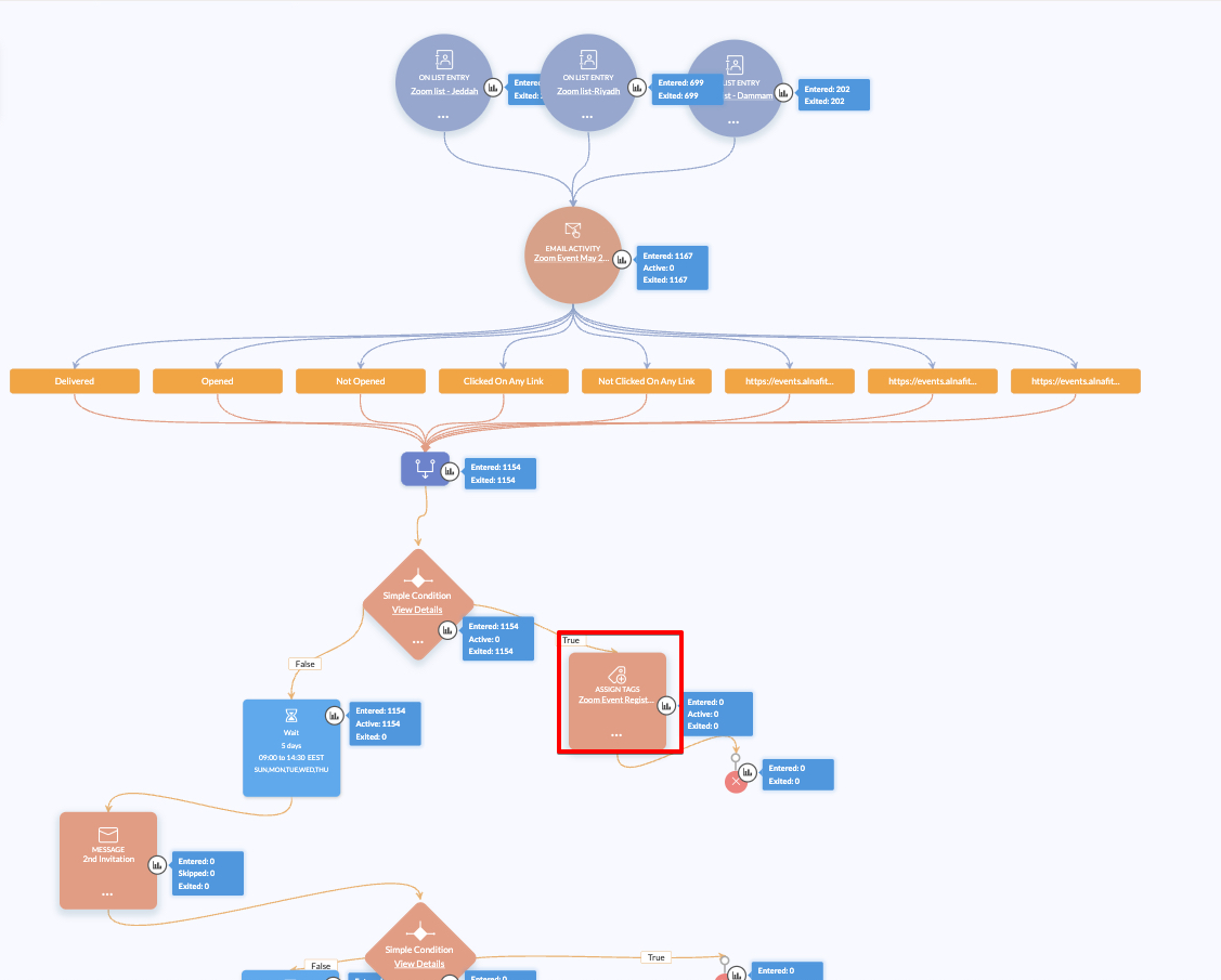 - The merged all these actions into a simple condition that triggers if any of these contacts are found in another list or not. If it's true >> they should assigned a certain tag!!! (check highlighted part with red in the screenshot)