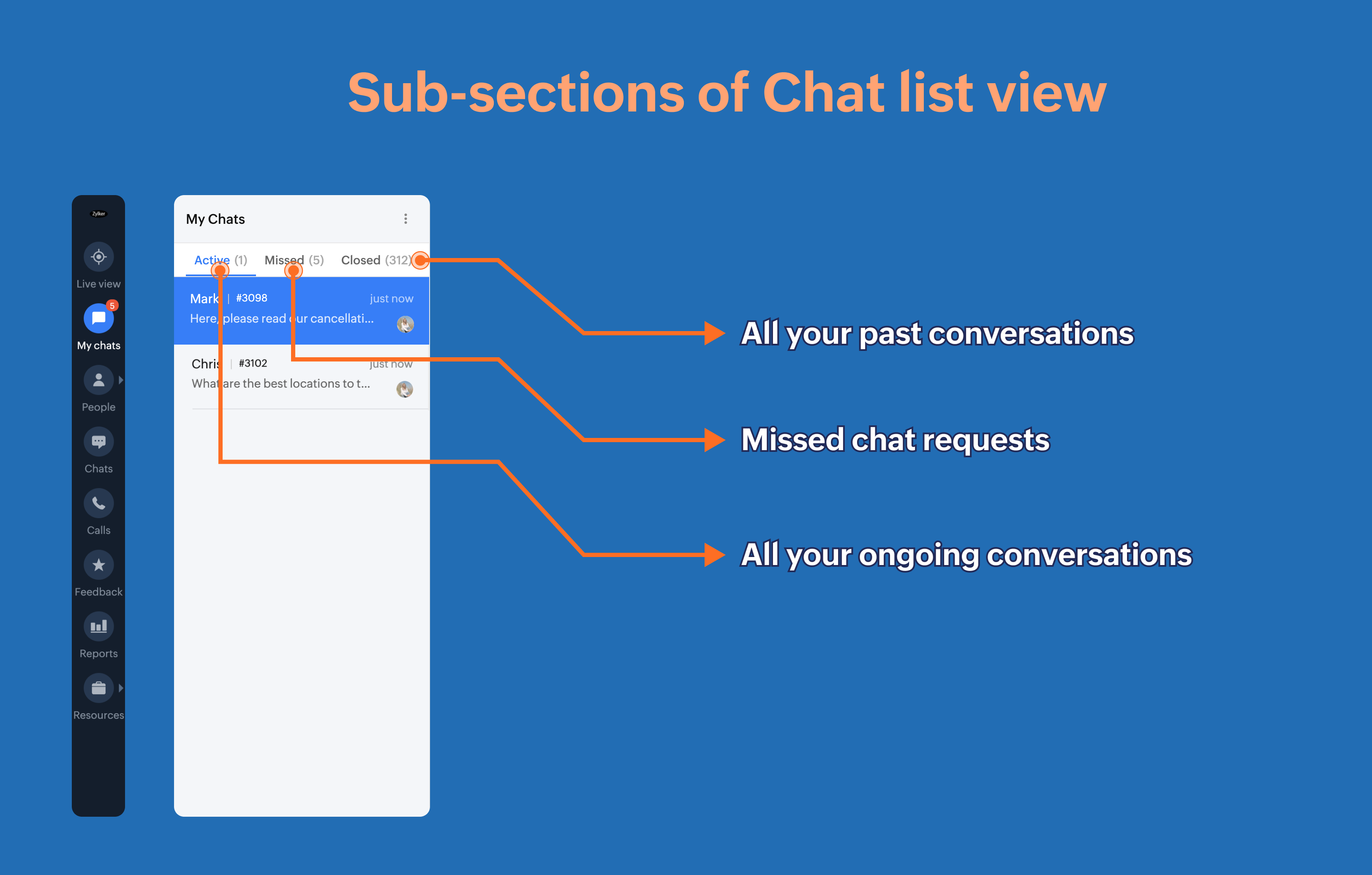 It lists all your chats in vertically stacked tiles that indicate each conversation with the essential details. You can click on a tile to open the conversation. This allows operators to manage many chats simultaneously without any hassle.