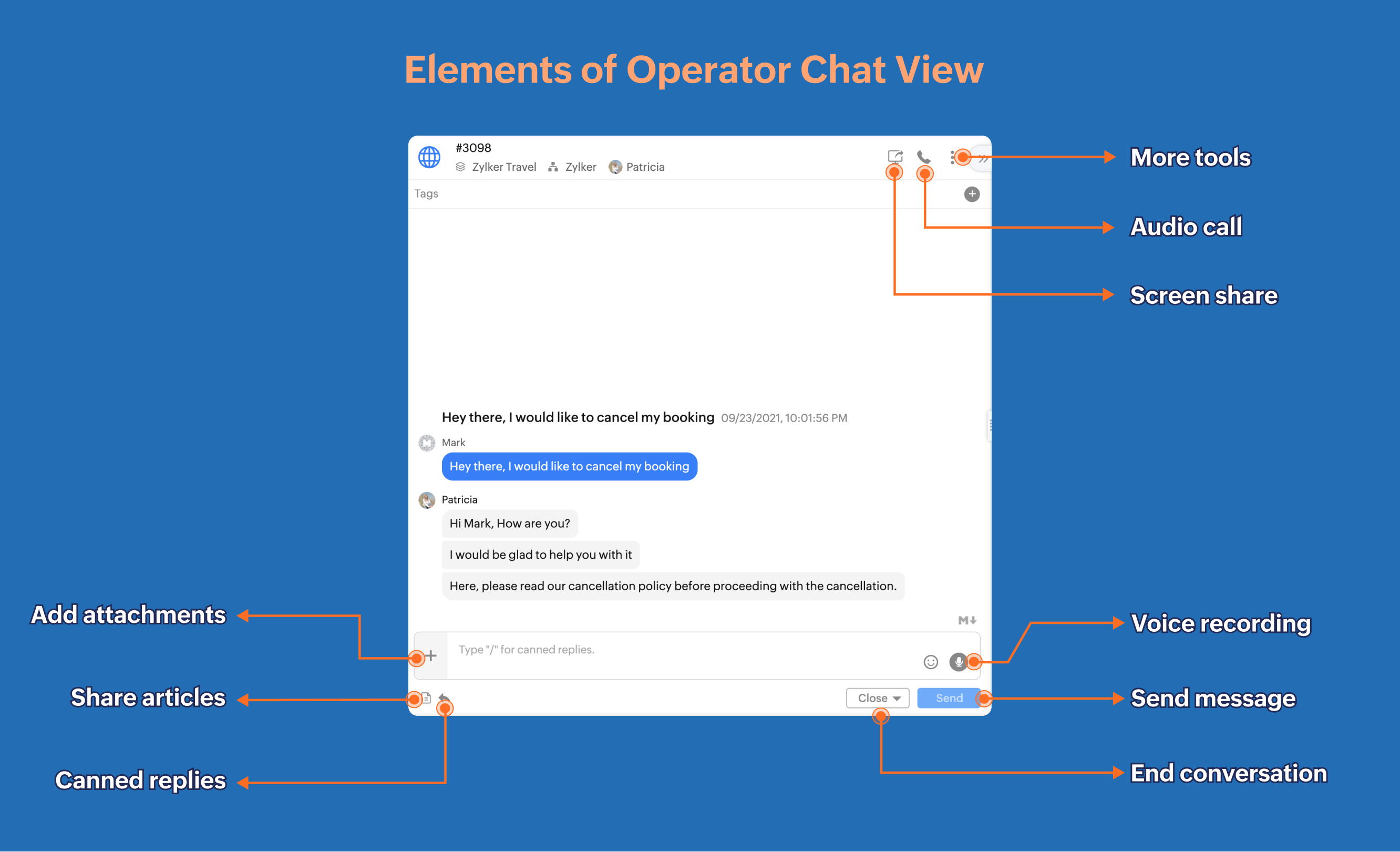 Before we dive deeper into the features of the SalesIQ chat window, let's understand how the chat widow is sectioned.