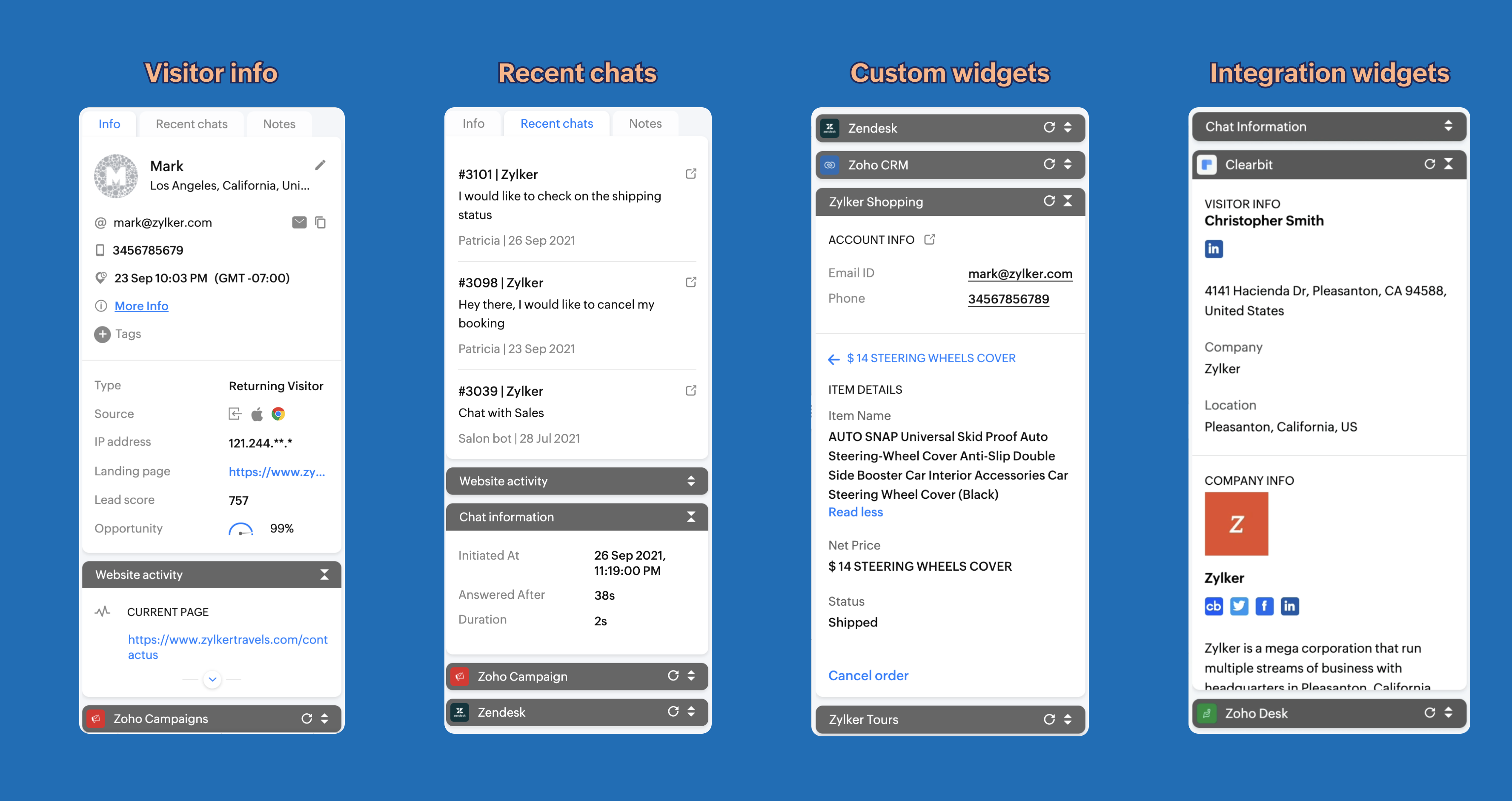 Integration widgets: Unlock a wide range of widgets that comes after integrating a service with SalesIQ. This can help you minimize the need to switch between tabs constantly to support your users. Integration like CRM and desk can help you view the visitor info and manage support tickets right inside the chat window.