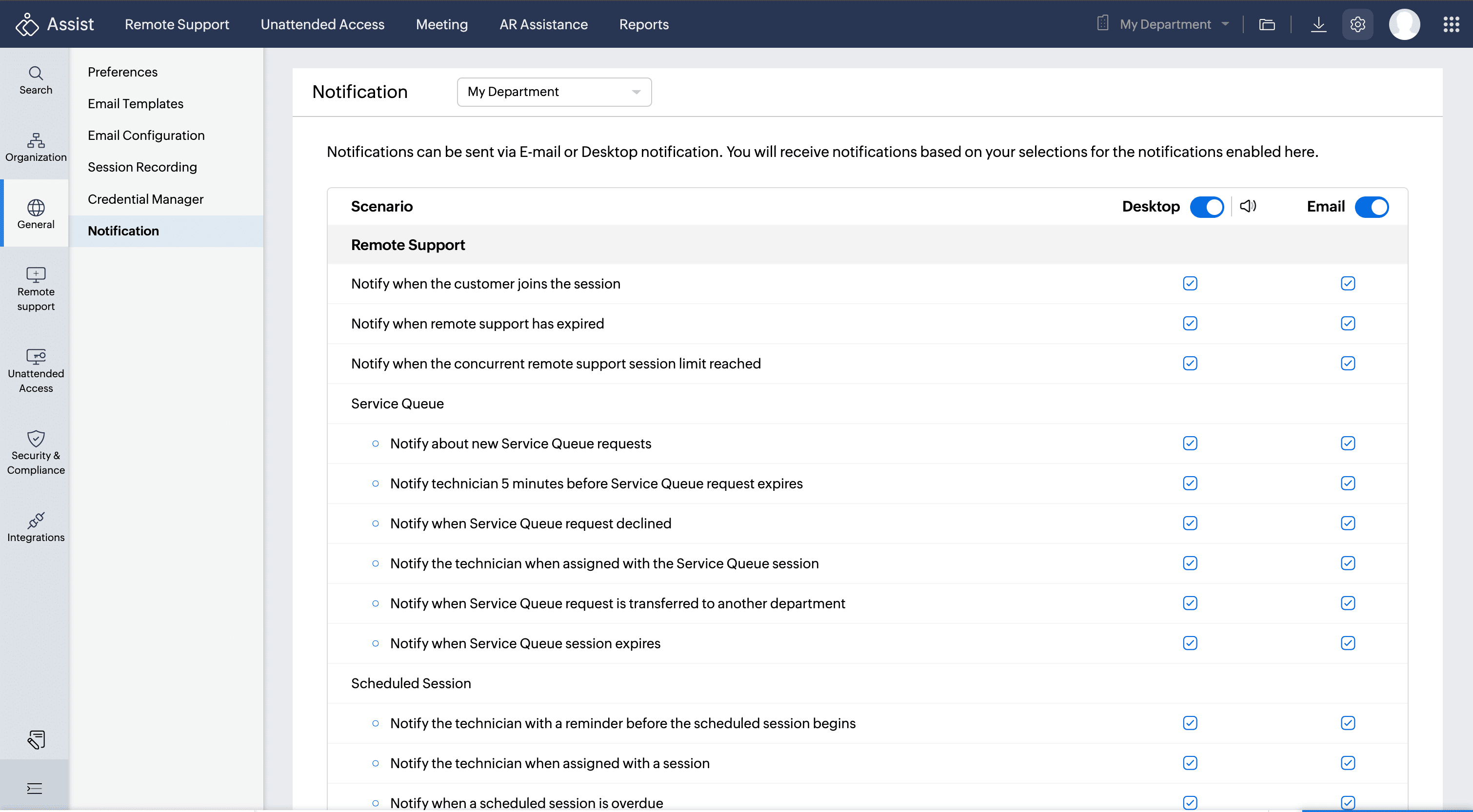 By setting up notifications in Zoho Assist, you ensure that critical session activities never go unnoticed. Whether you're managing a small team or a large support operation, these real-time alerts help you stay aware, respond quickly, and maintain clear oversight of remote sessions—leading to more efficient support and better user experiences. If you encounter any issues or require further assistance, contact support@zohoassist.com.