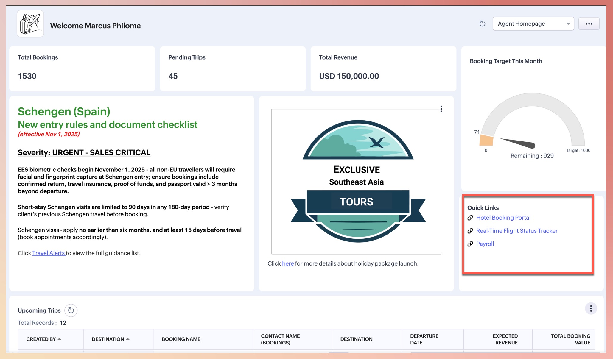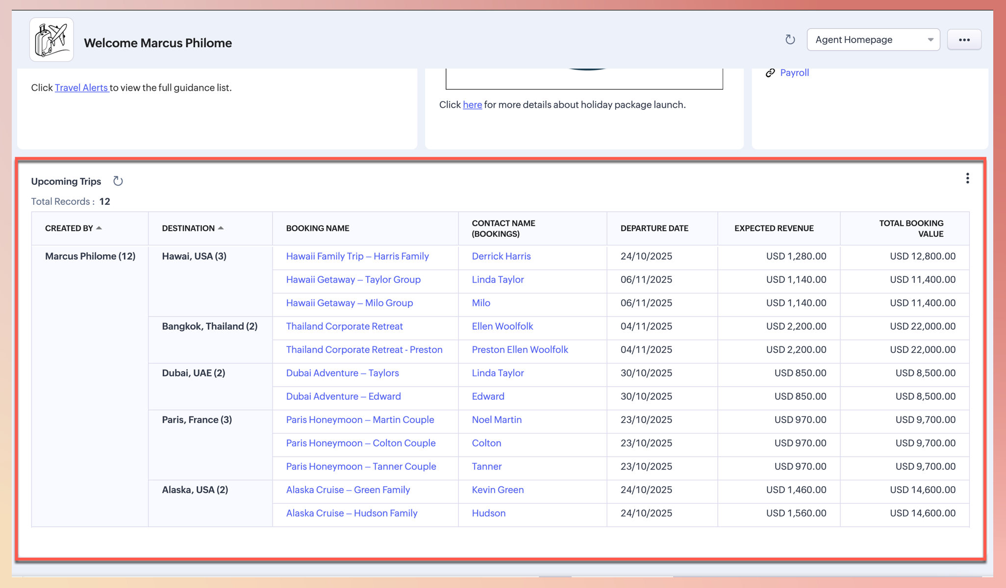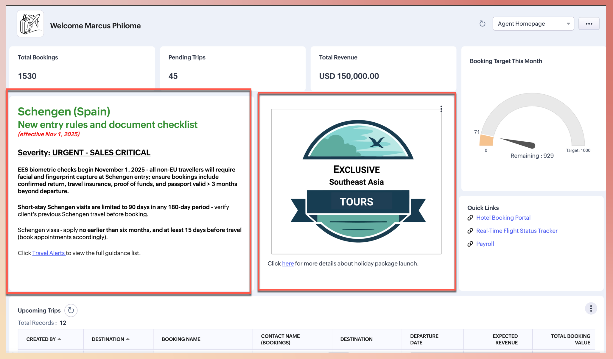 For example, the admin of our travel agency can display the Upcoming Trips and Commission Forecast report component on the agent homepage layout so agents can view upcoming trips and the total commission pipeline effortlessly and instantly upon logging in—without navigating to the dedicated Reports module.