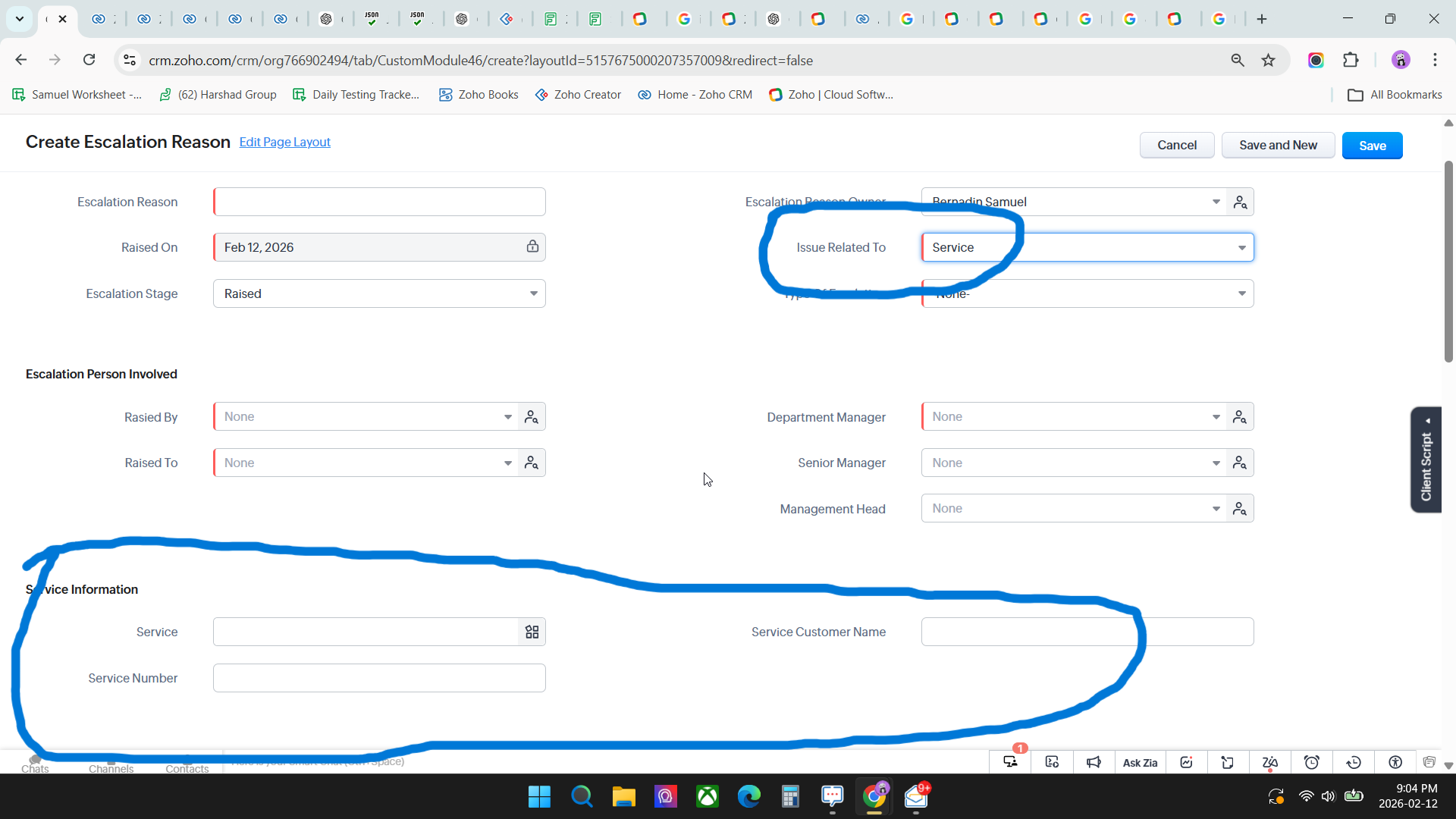 • using the Client script on the load of the form if service no is empty means then i want to make issue relate to is Service