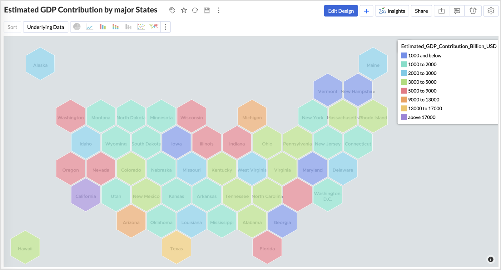Geo map visualizations now support US Hex Bin projection - a clean, equal-area representation of US state-level data that eliminates the visual bias of traditional geographic maps. Each state is represented as a uniform hexagon, making it easier to compare data across states regardless of their physical size.