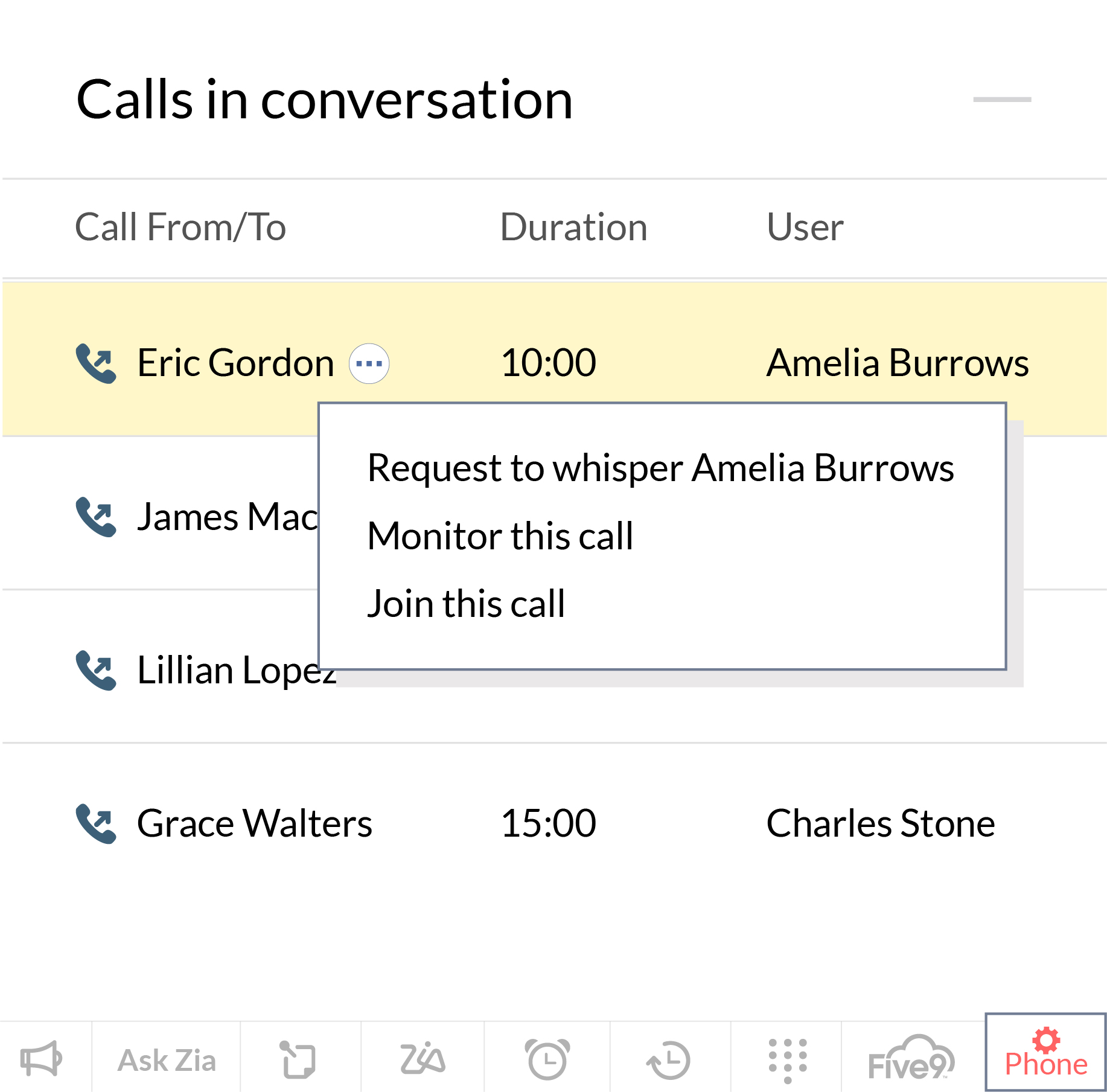 Our native integration allows managers to monitor, coach, and help their reps to get better at sales calls. Zoho CRM allows them to keep an eye on how their reps are performing in their active calls, and manage calls that are in the queue waiting. Sales managers can also coach new sales reps as they progress through a call and jump in directly to take the lead when the situation calls for it.