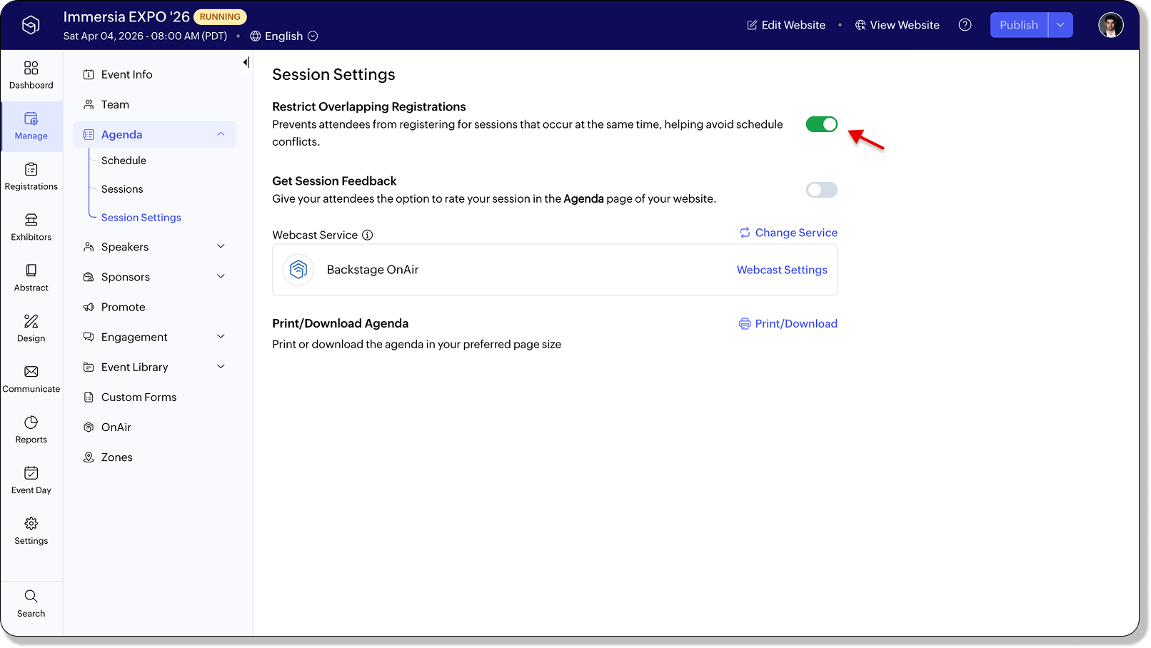 This applies both during ticket purchase and when registering from the agenda. If needed, you can still manually add attendees to overlapping sessions from the Session Registration or Check-In tabs. You can enable this setting from Manage > Agenda > Session Settings.