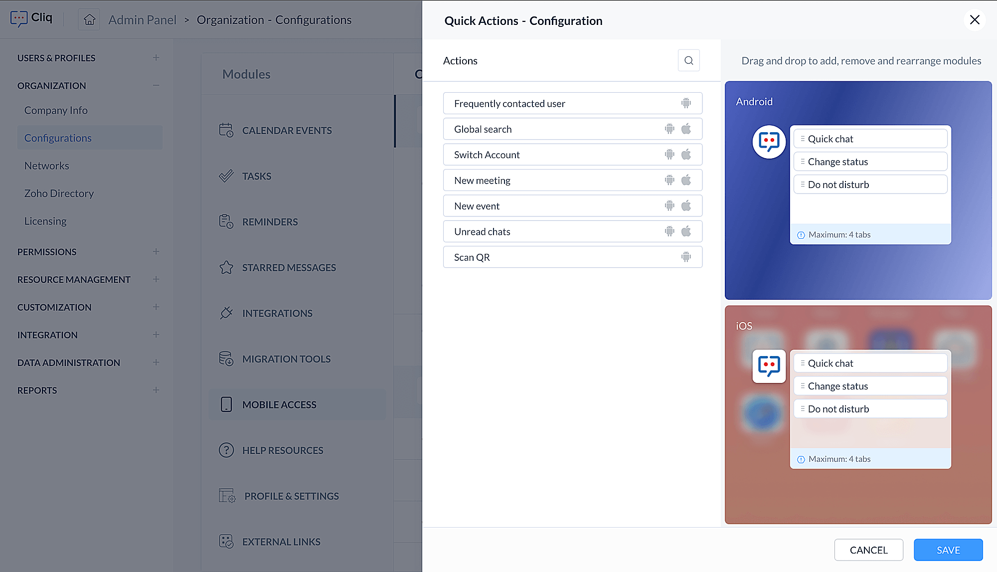- Admin configuration to customize shortcuts for Cliq iOS and Android apps: Admins can now personalize the Cliq app's shortcut menu on iOS and Android devices. This allows them to choose which shortcuts should appear when their organization's users press and hold the app icon, including frequently contacted users, unread chats, switching accounts, and more. By tailoring the app's functionality to their organization's needs, admins can improve user experience, navigation, and productivity.