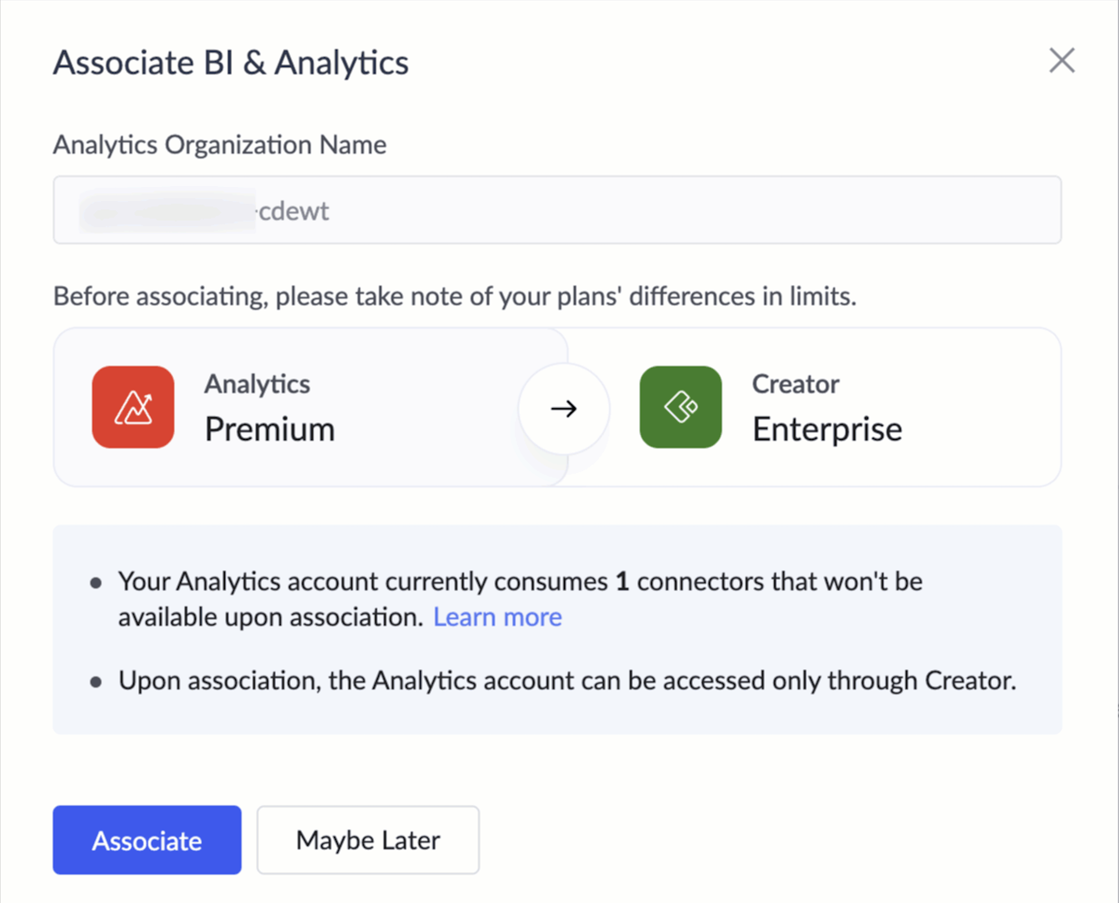 Now with low-code and data analytics being all the rage, such users would be in a conundrum on how to link up both their accounts. With them in mind, we've come up with a smoother association between Zoho Analytics accounts and the C6 accounts. With just a couple of clicks, you can seamlessly associate and port the entire data from your Analytics account into C6, and your subscription plans will also be adjusted accordingly.