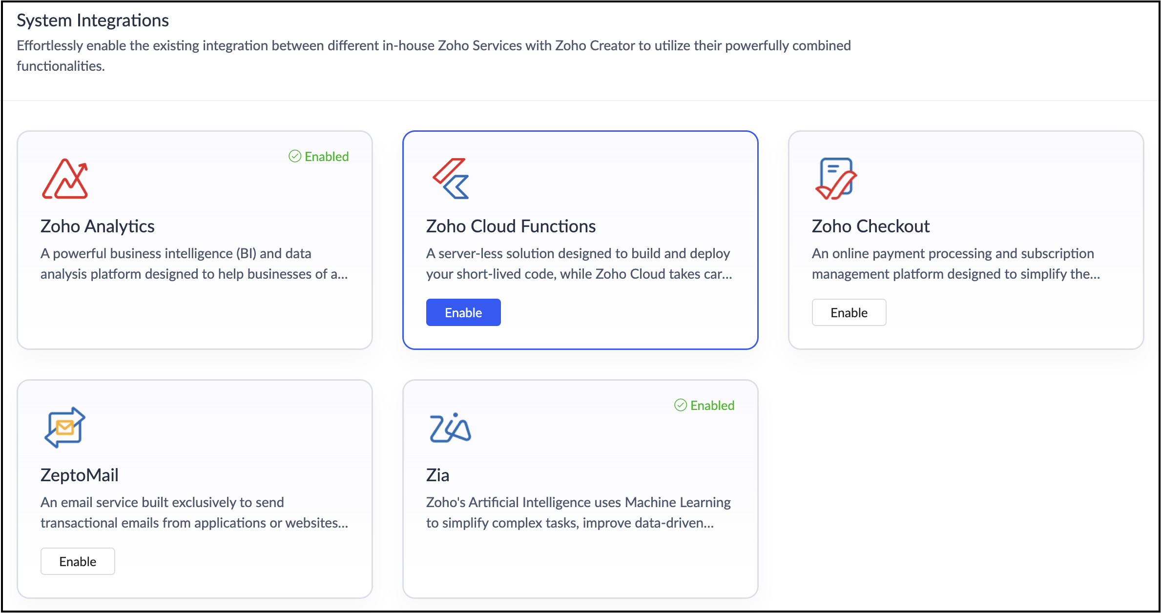 The integrations with the following Zoho services can be managed from the System Integrations page: