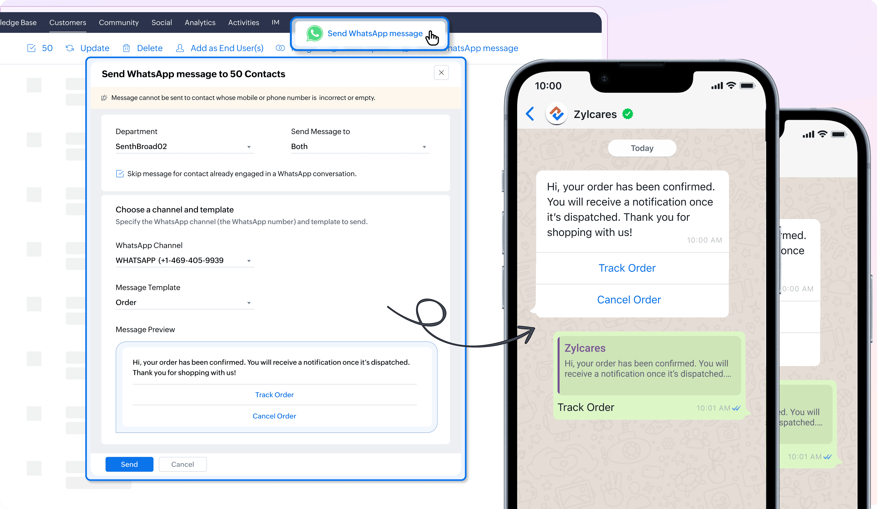 Agents can send WhatsApp messages to multiple contacts at once, which is useful for various activities, such as onboarding and customer engagement programs. There’s also an option to skip sending messages to contacts who are already engaged in a conversation with another agent to avoid interruptions in the ongoing conversation.