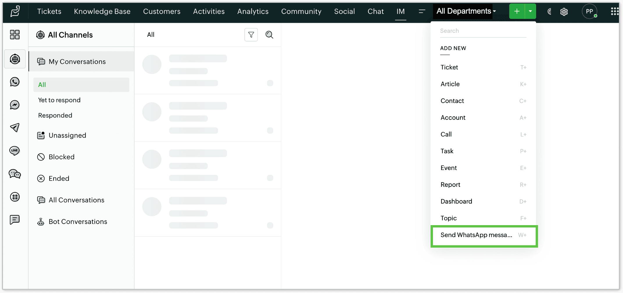 A new shortcut, +w, has been introduced to streamline sending WhatsApp messages directly from the Tickets module. When using +w, users can quickly initiate a WhatsApp message to the associated contact. If the message is being sent to a new contact, their details will be automatically recorded within the system, and autopopulated in the Contact's record. For example, if a new customer contacts the support via WhatsApp and their details are not yet in Zoho Desk, sending a reply will automatically create a new record in the Contacts module.