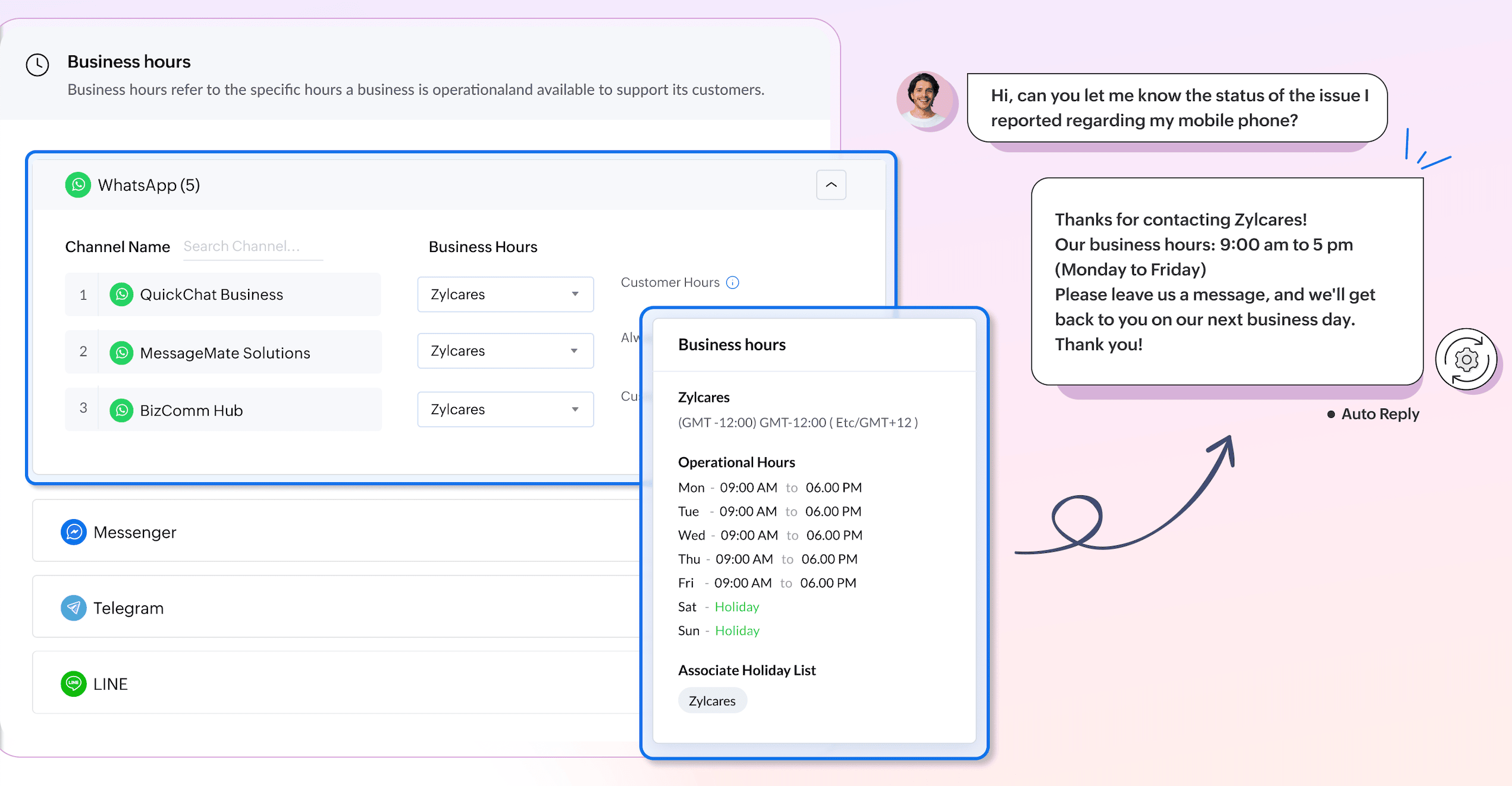 Business hours can be configured for various IM channels, including WhatsApp, Messenger, Telegram, and Line, ensuring that customer inquiries are managed efficiently within the designated timeframes. Setting business hours involves defining the times when a business is open and available to assist customers. This ensures that the support team operates in alignment with these hours.