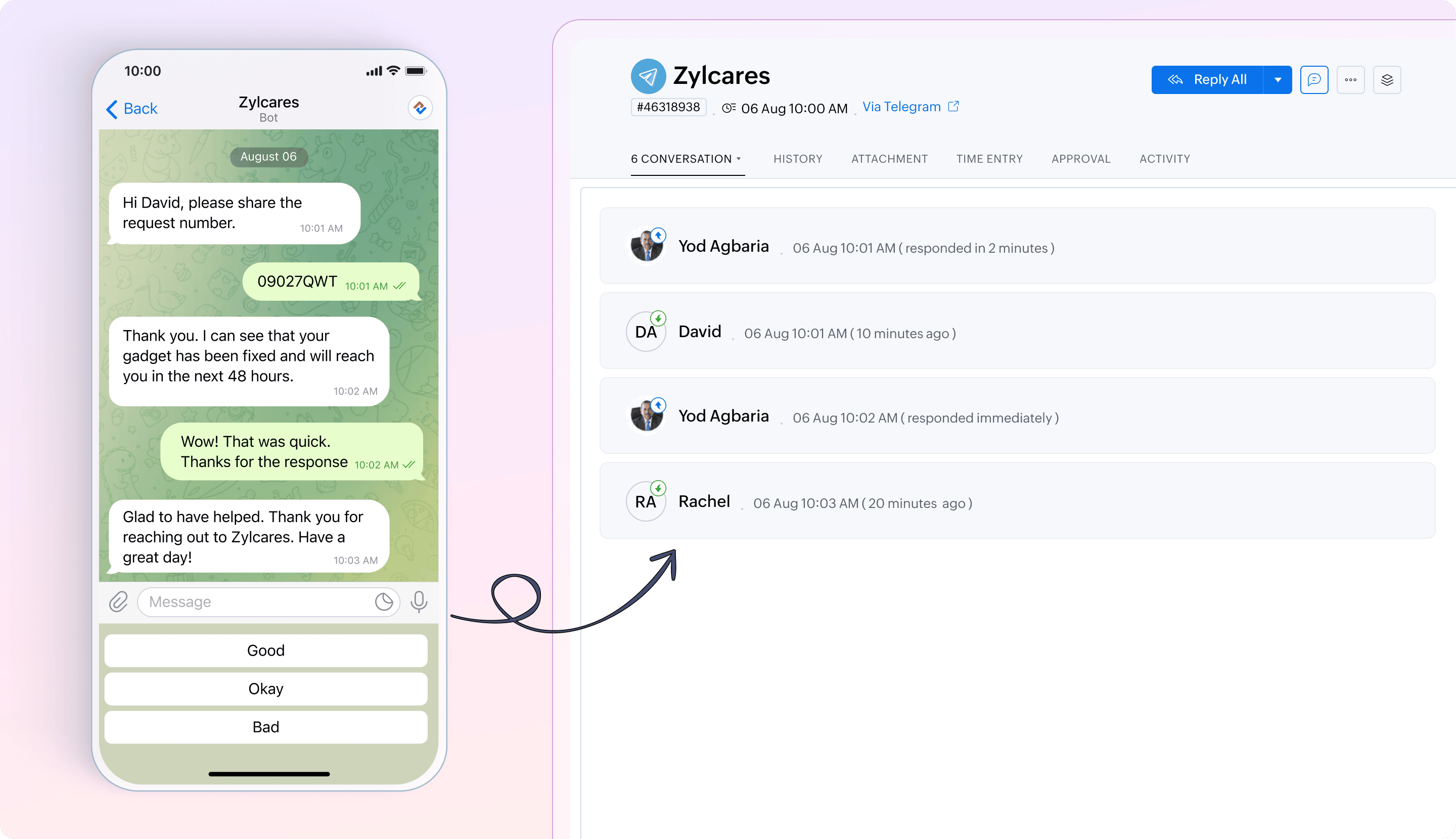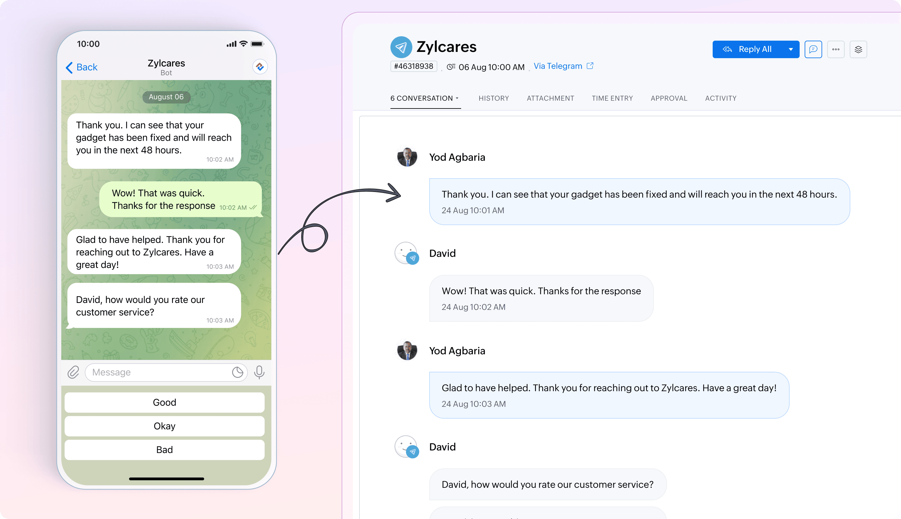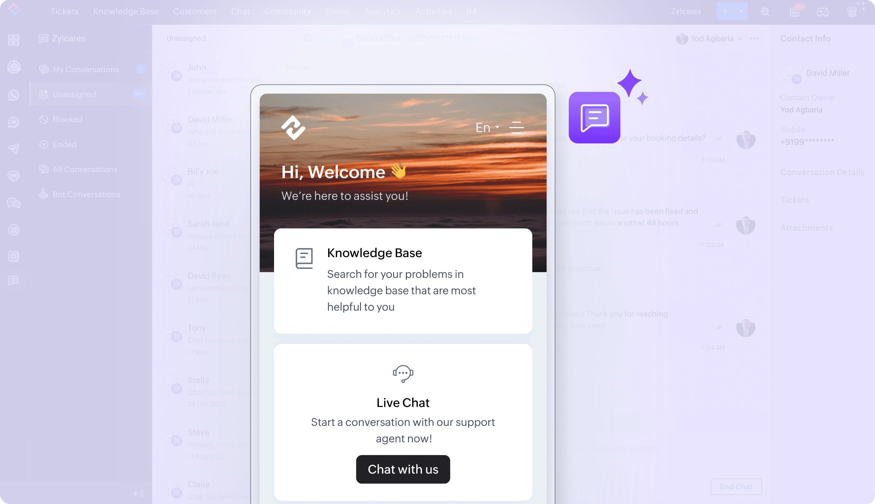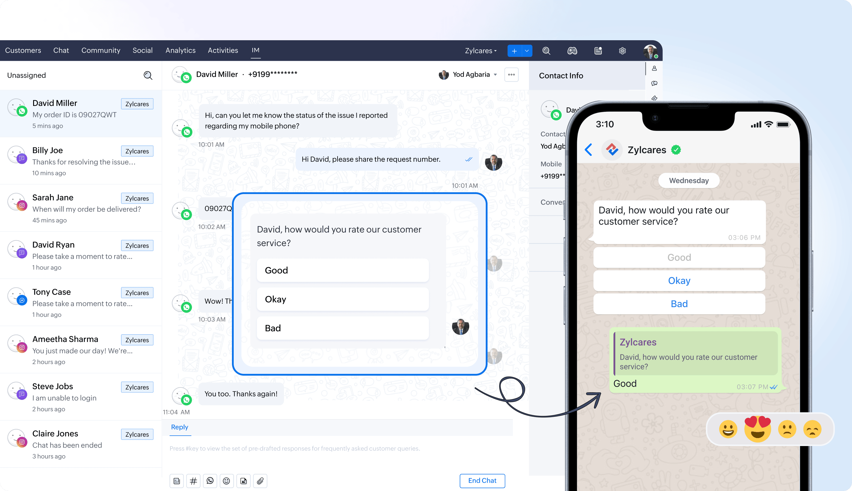 Collect feedback on customer satisfaction for interactions conducted through the IM channel. A customer's happiness rating helps to see what they think about the support they receive at the end of each response or after closing their ticket. The integrated analytics will also assist the business in monitoring the ratings received by the agents or given by their contacts and accounts across various time frames.