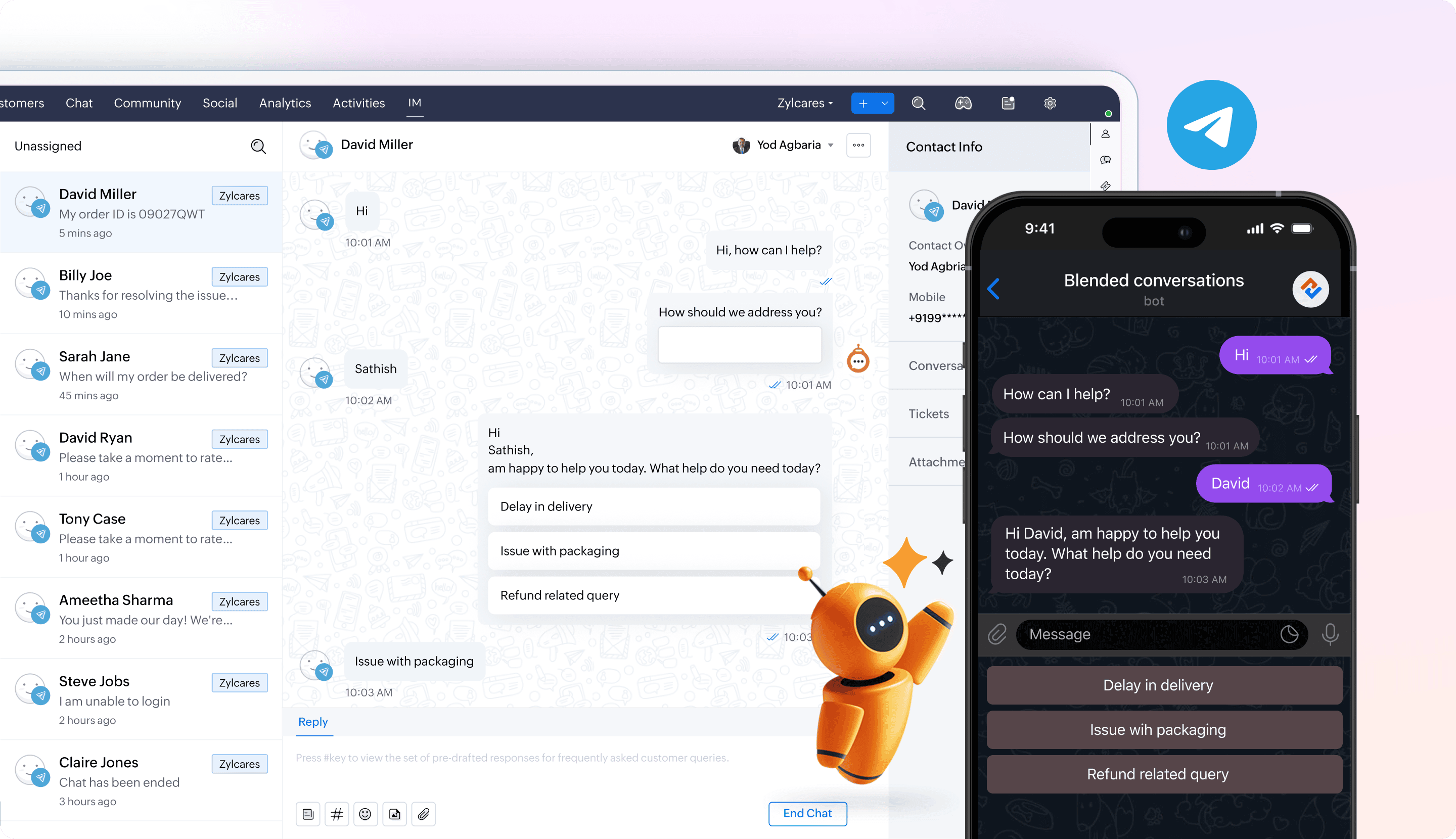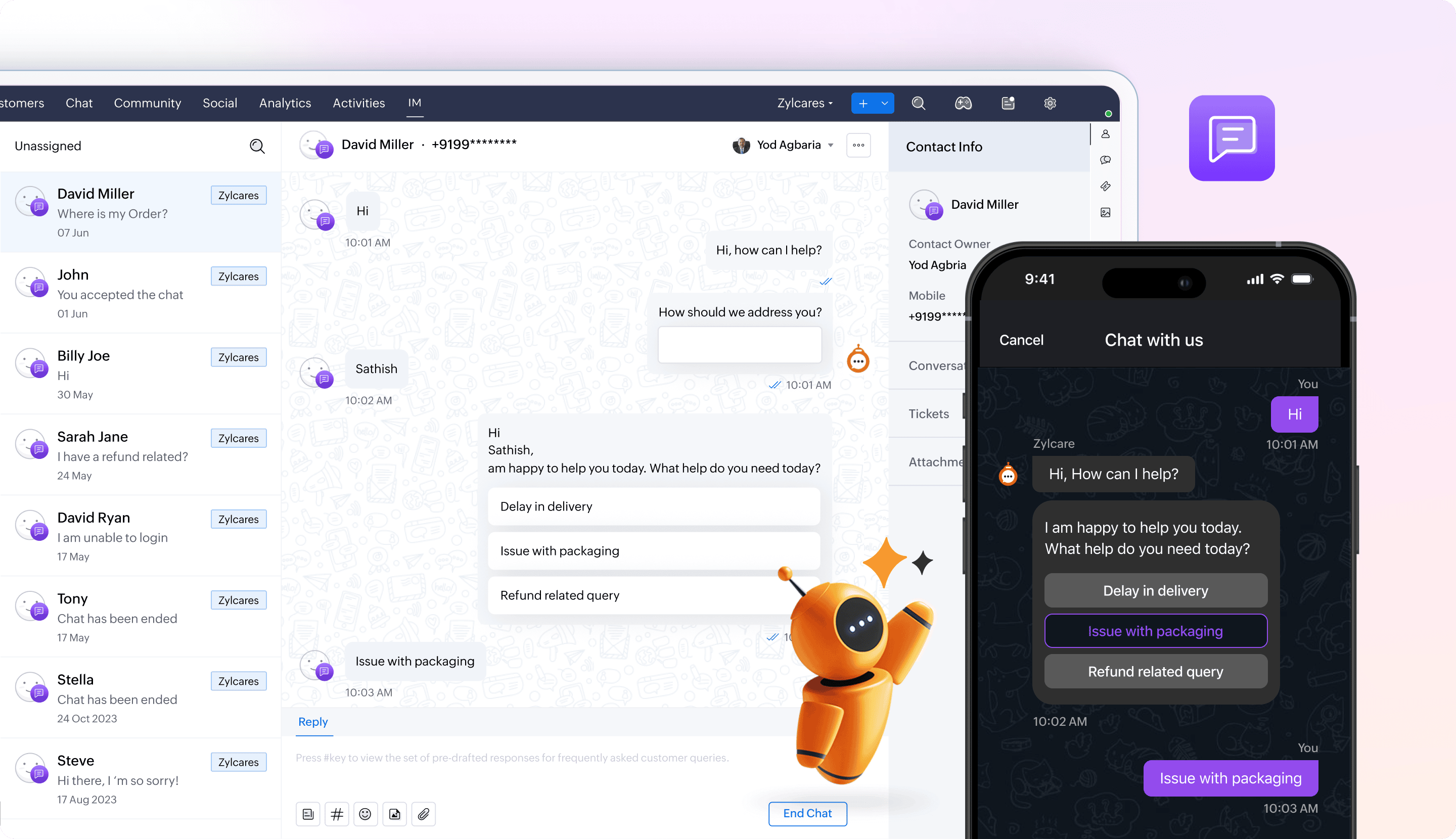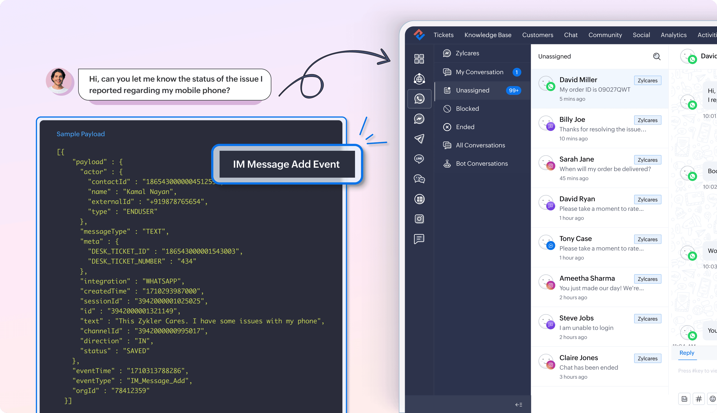 Zoho Desk's instant messaging webhooks enable automation of event-driven tasks between messaging apps and business workflows. By leveraging IM webhooks, businesses can integrate multiple channels into their business workflows, creating a seamless conversational ecosystem that enhances the customer journey and meets their preferences. For example, an ecommerce platform can automatically share package delivery OTPs via WhatsApp, an insurance provider can send payment reminders, and a travel agency can deliver booking details—all triggered through the webhooks in IM.