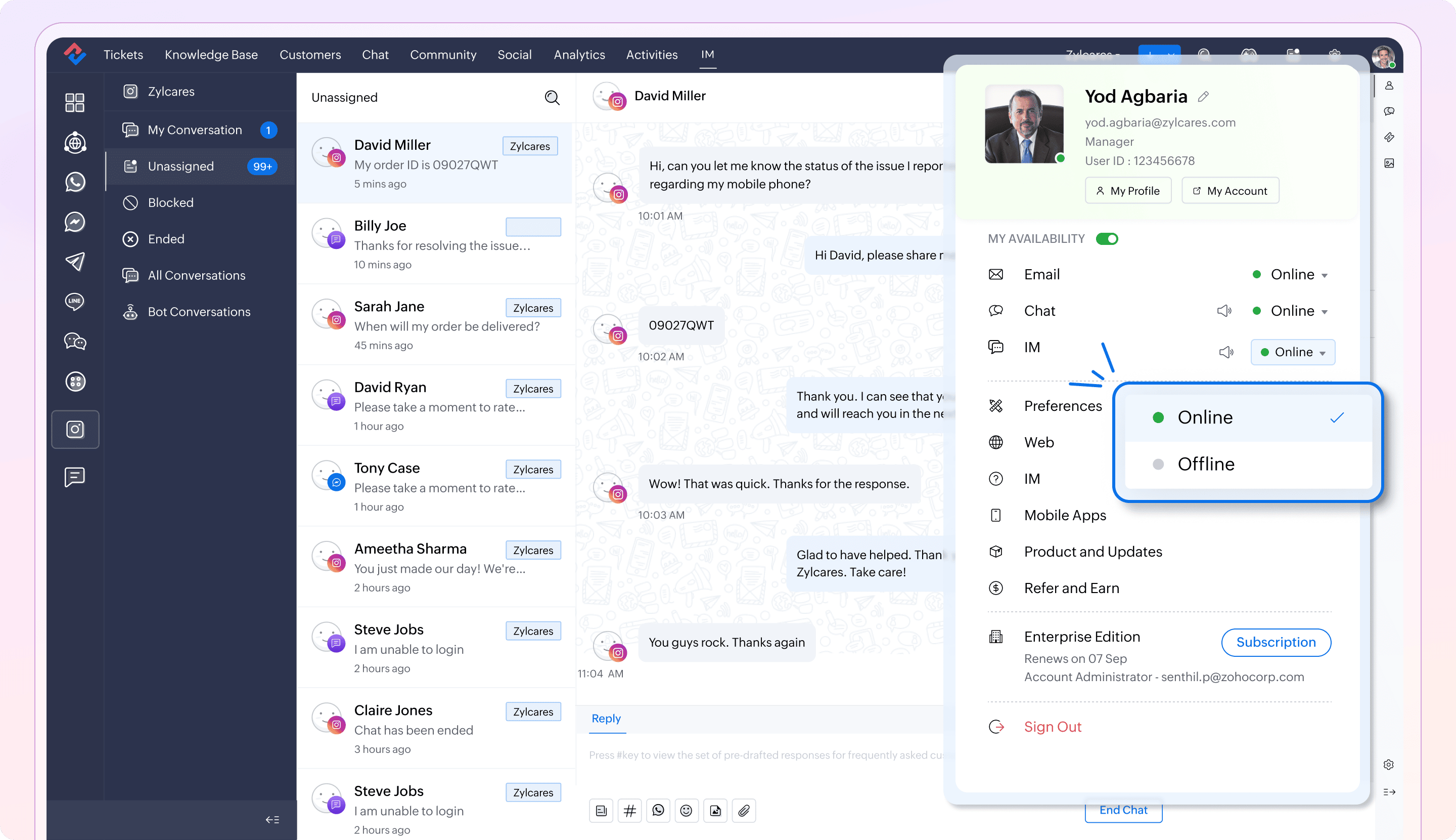 Agents can set their status as online or offline specifically for the Instant Messaging feature. This allows them to control their visibility and mute all IM notifications with a click, ensuring uninterrupted work during critical tasks.