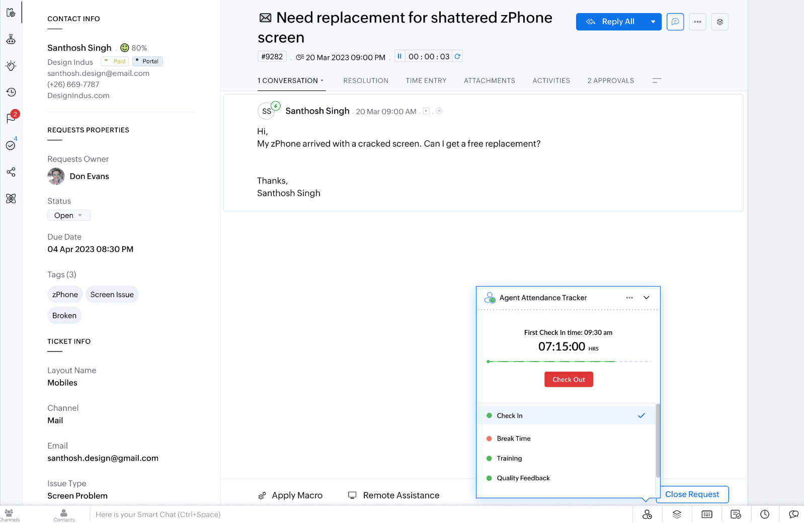 Integrating Zoho Desk with agent attendance tracker | Standard and above