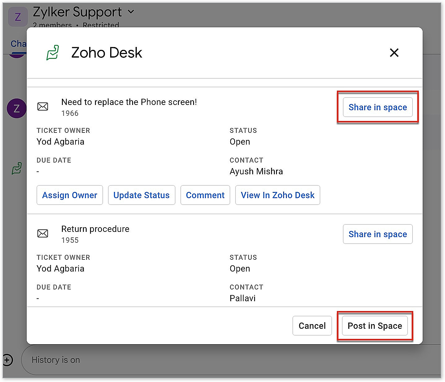 Imagine a user operating an e-commerce business. With this integration, their customer support team can swiftly address customer inquiries without leaving Google Chat. For instance, an agent can view a support ticket in Google Chat Spaces, assign it to a team member, and update its status—all within the chat interface, saving time and reducing chances of inadvertent errors.