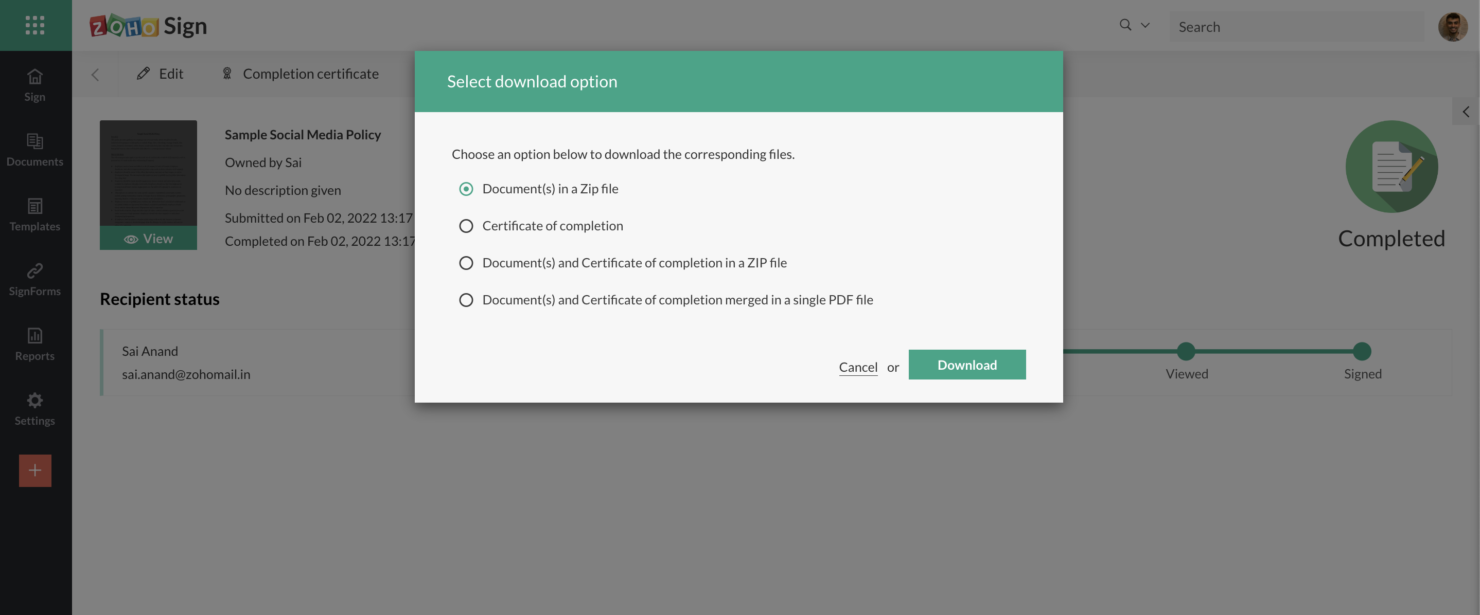 Users now have multiple options to choose from when downloading documents from Zoho Sign. Users may choose to download just the documents in a request (in a ZIP file if more than one), or just the completion certificate, or all of them in a ZIP file, or all of them merged into a single PDF file. In the case of the merged PDF file, the file will only contain the common digital signature certificate issued to Zoho Sign and the signatures of the individual signers will be captured merely as visible signatures.