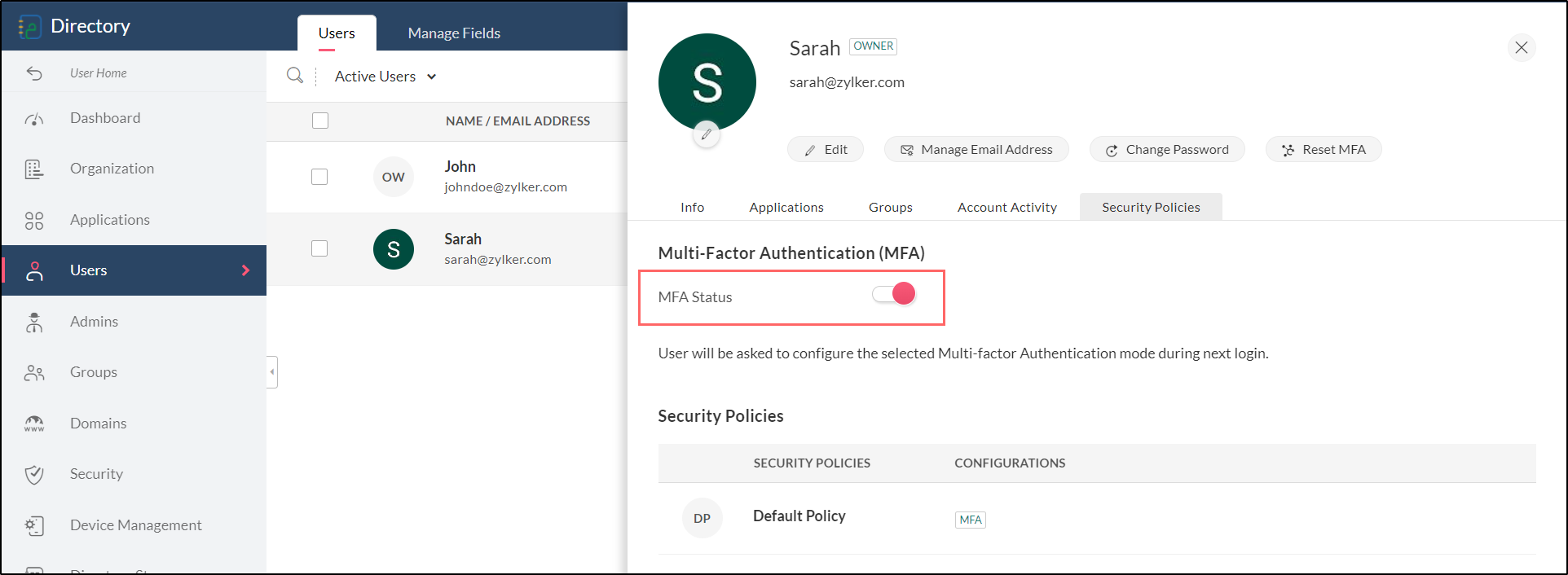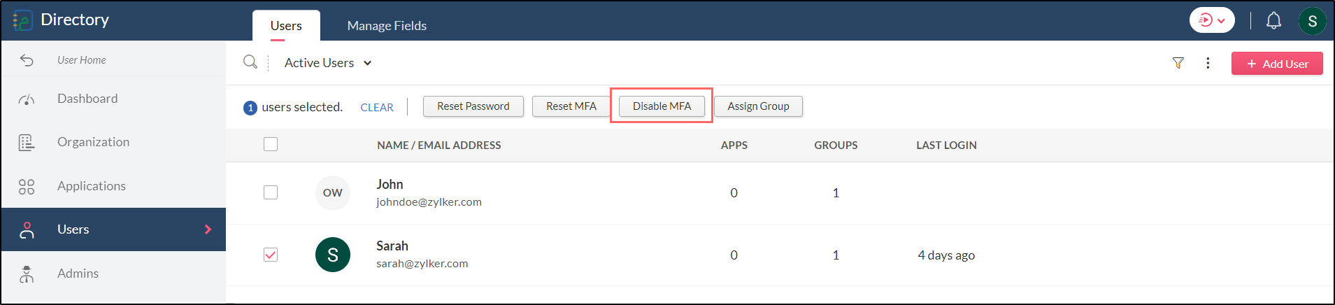 To disable/re-enable MFA for your organization users, we recommend using Zoho Directory. It allows you manage your users across multiple Zoho apps from a single place. Refer to instructions below