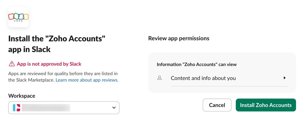 Slack manages strict security and quality standards for third-party applications. Any app that integrates with Slack must go through an approval process to meet their compliance and security guidelines. Our Zoho integration is currently under Slack's review process. Meanwhile, you can still access your Zoho account by clicking Install Zoho Accounts on the consent page.
