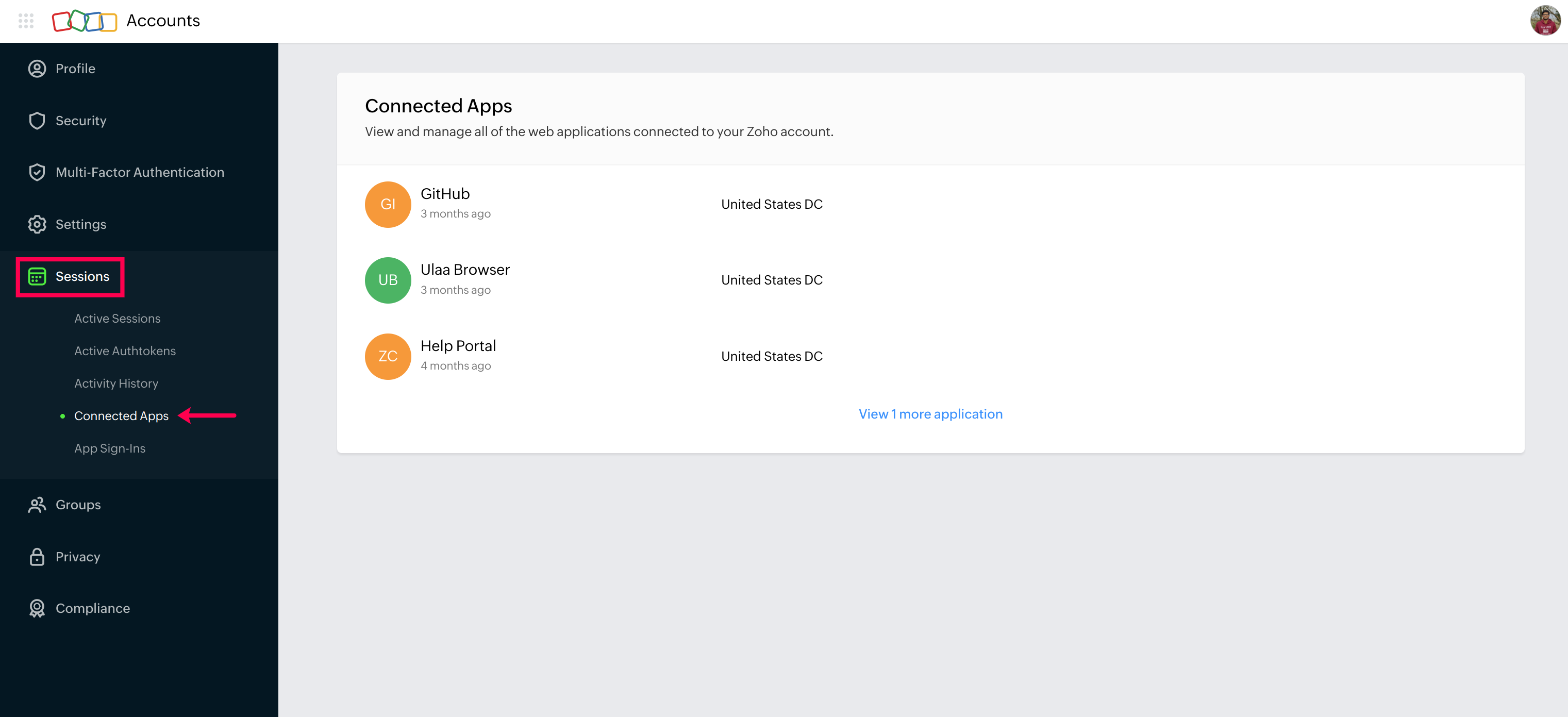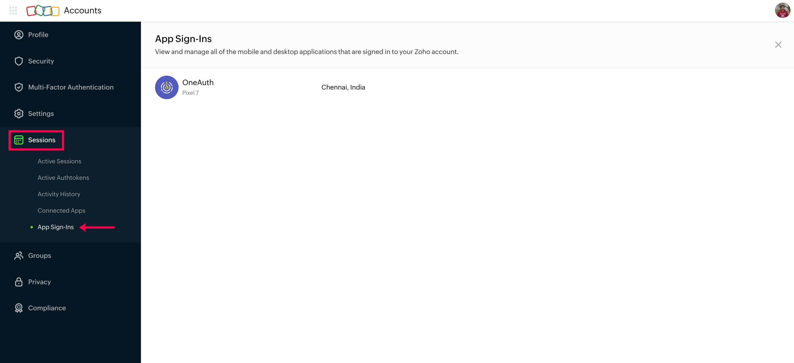 You can delete any of your app sign-in sessions. However, if you're using Zoho OneAuth, the primary device session cannot be deleted.