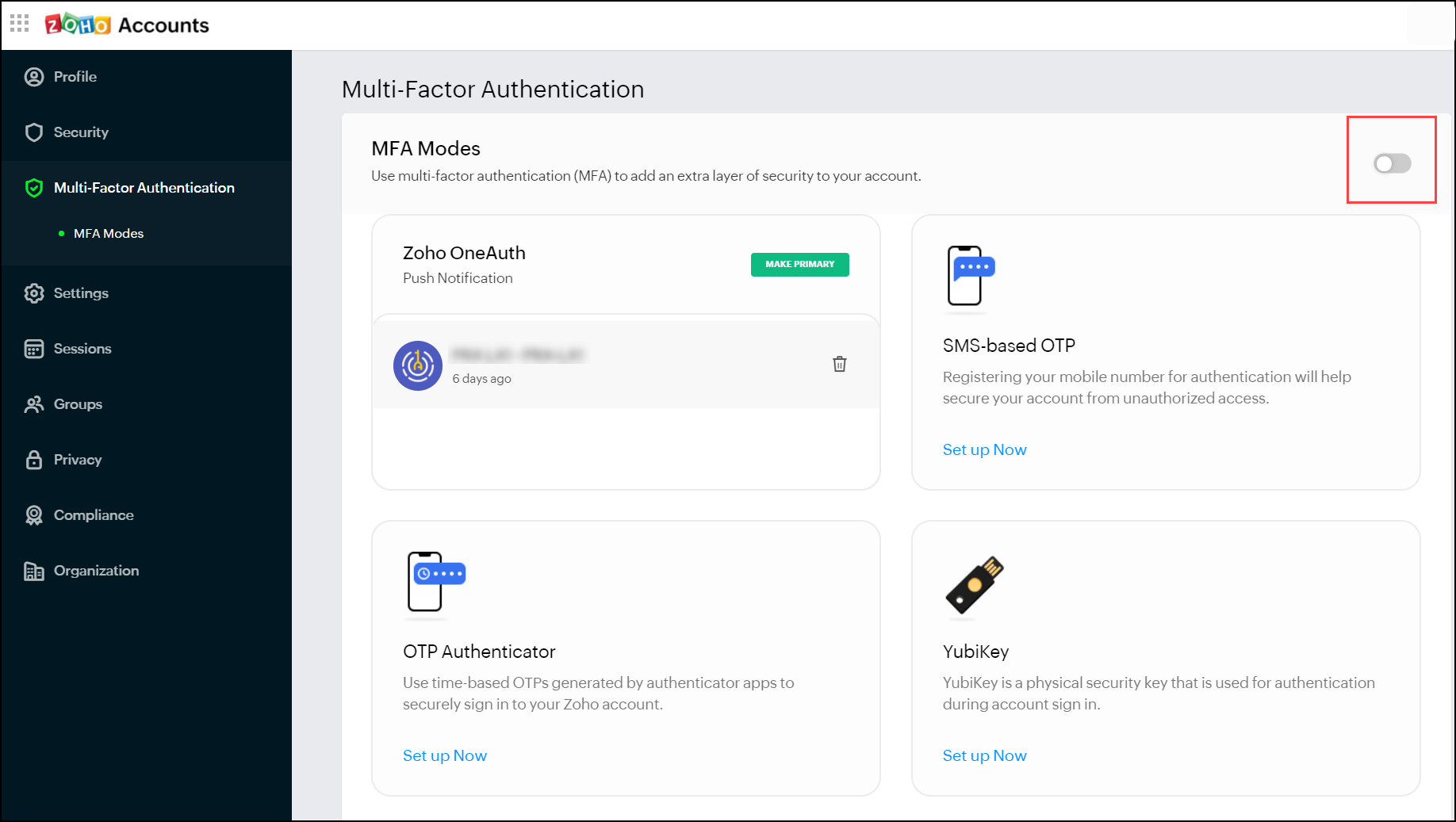 Note You won't be able to see the toggle, if your admin has enforced MFA for your account. Instead of the toggle, you will see the label   displayed next to MFA Modes. Contact your admin for further clarification.