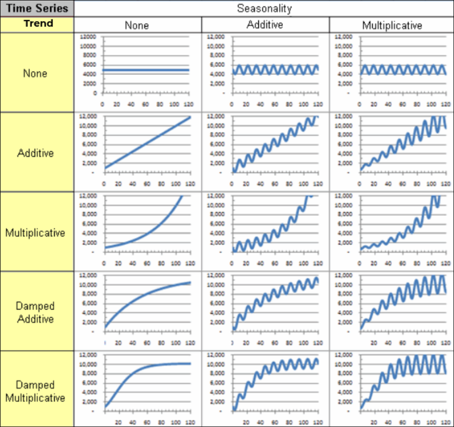The forecasting engine in Zoho Analytics provides a variety of exponential smoothing techniques, for different types of time series data. The following image illustrates the various combinations of the different trend and seasonality components that result in ETS models.