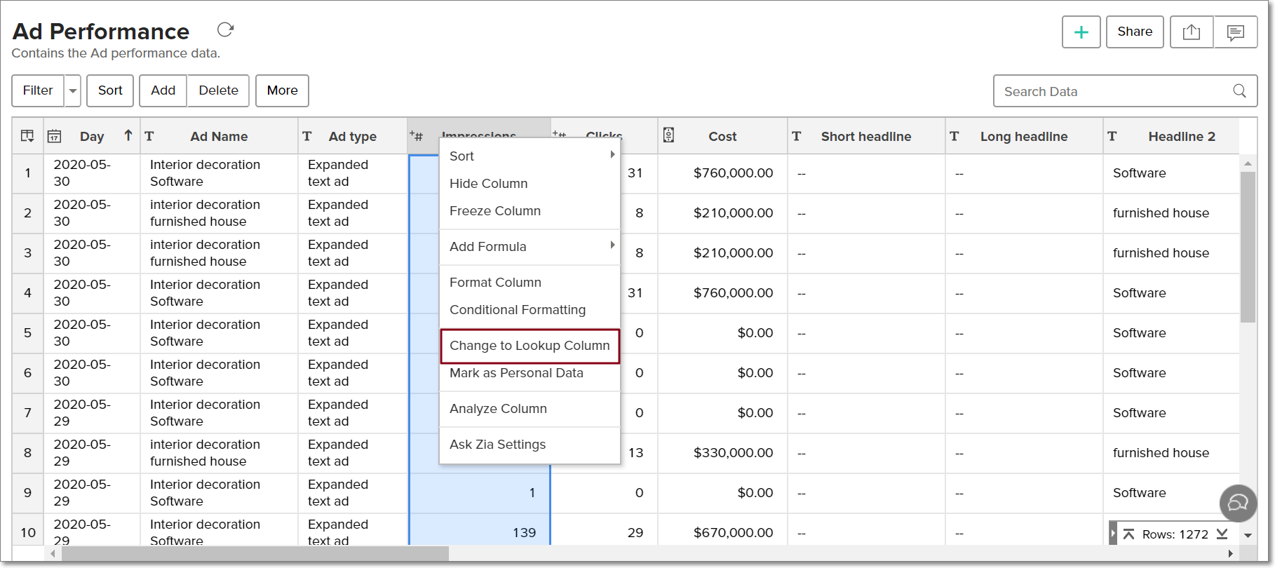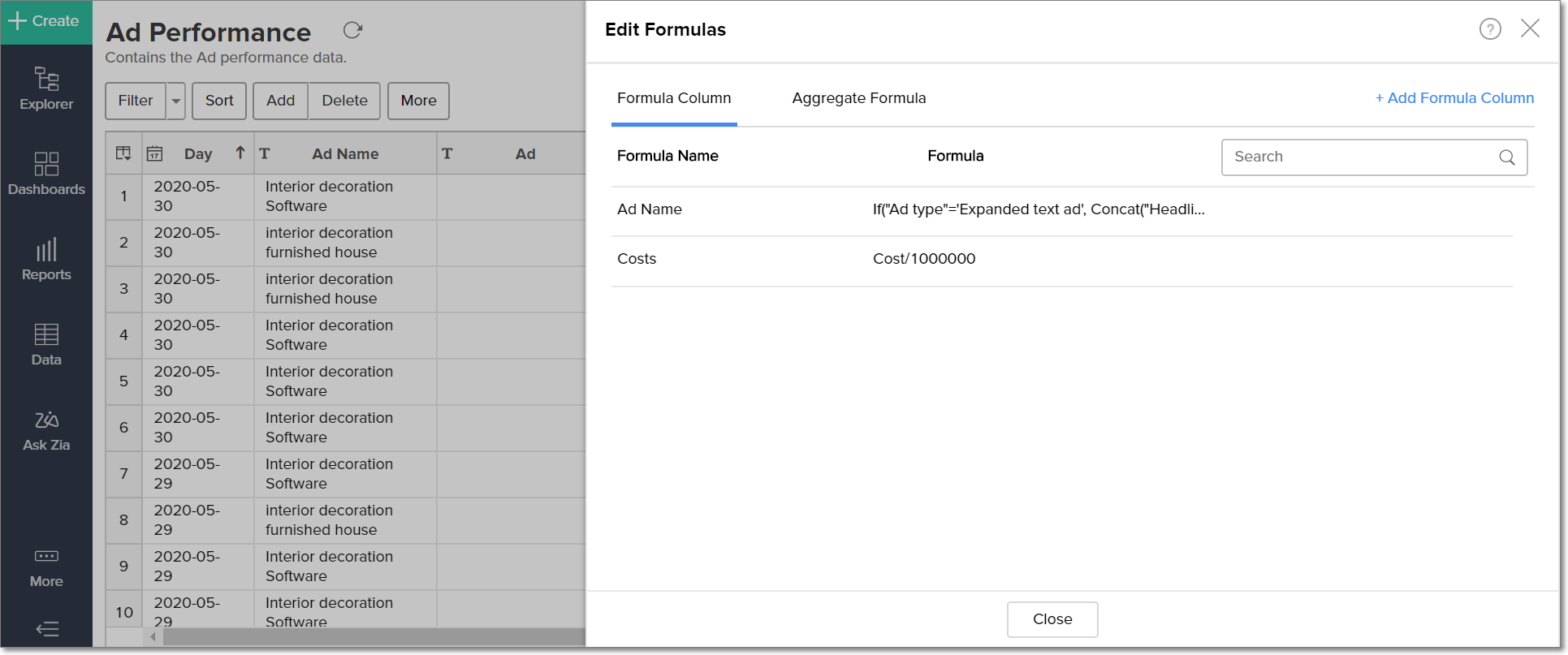Formulas are calculations that can be defined using the powerful formula engine in Zoho Analytics, to create required reports. Refer this documentation to know more. There are also several default formulas created based on the Google Ads modules. To view the default formulas, open the required table, click Add and select the Edit Formulas option.