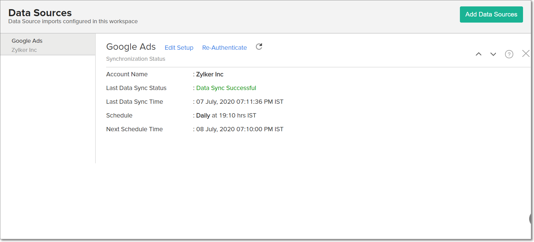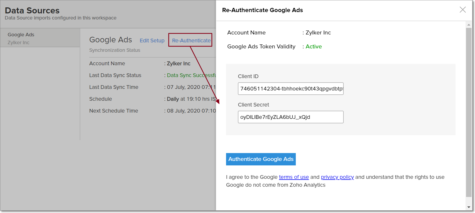 The synchronization of your Google Ads data can sometimes fail, due to several reasons. To resolve this, click the Data Sources option from the side panel and click the Re-Authenticate link. In the popup that appears, click Authenticate Google Ads. Enter the Google Ads Client ID and Secret, and click the Authenticate Google Ads button.