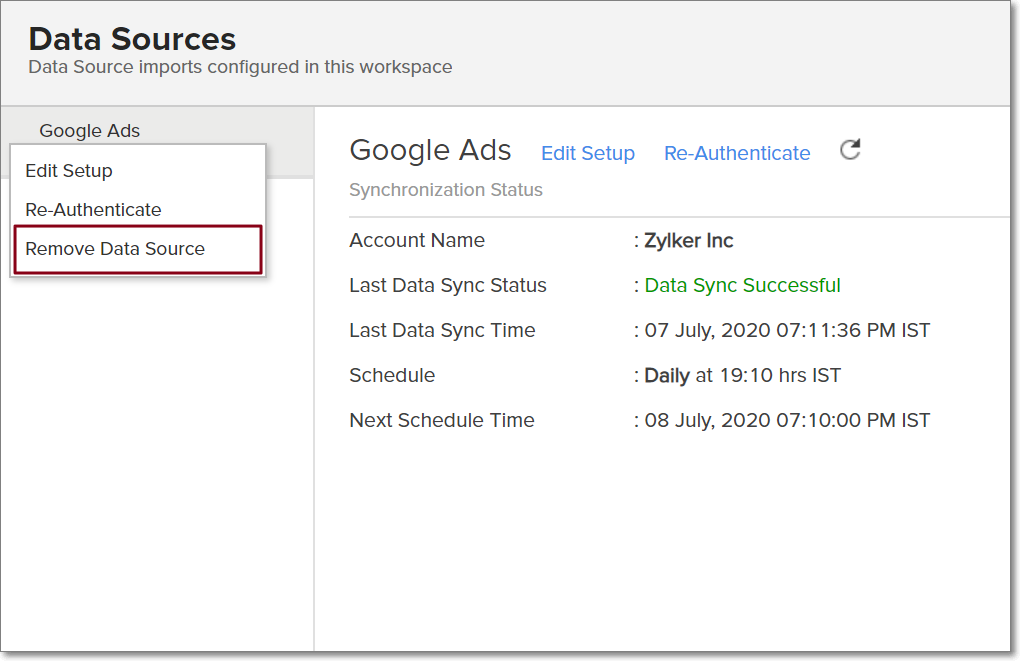 To edit the connection and synchronization settings, select Data Sources -> Google Ads from the side panel.