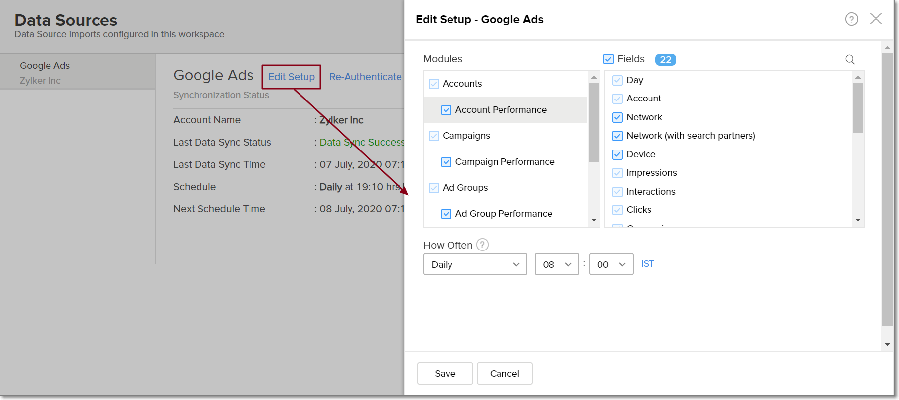 Schedule: The frequency of data synchronization between Zoho Analytics and Google Ads.
