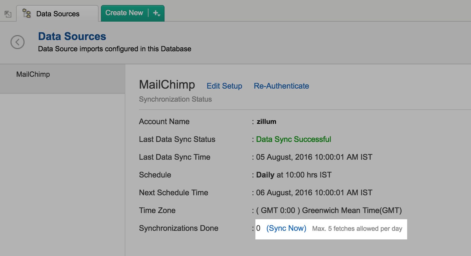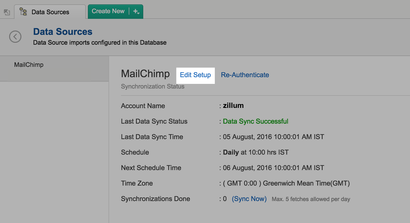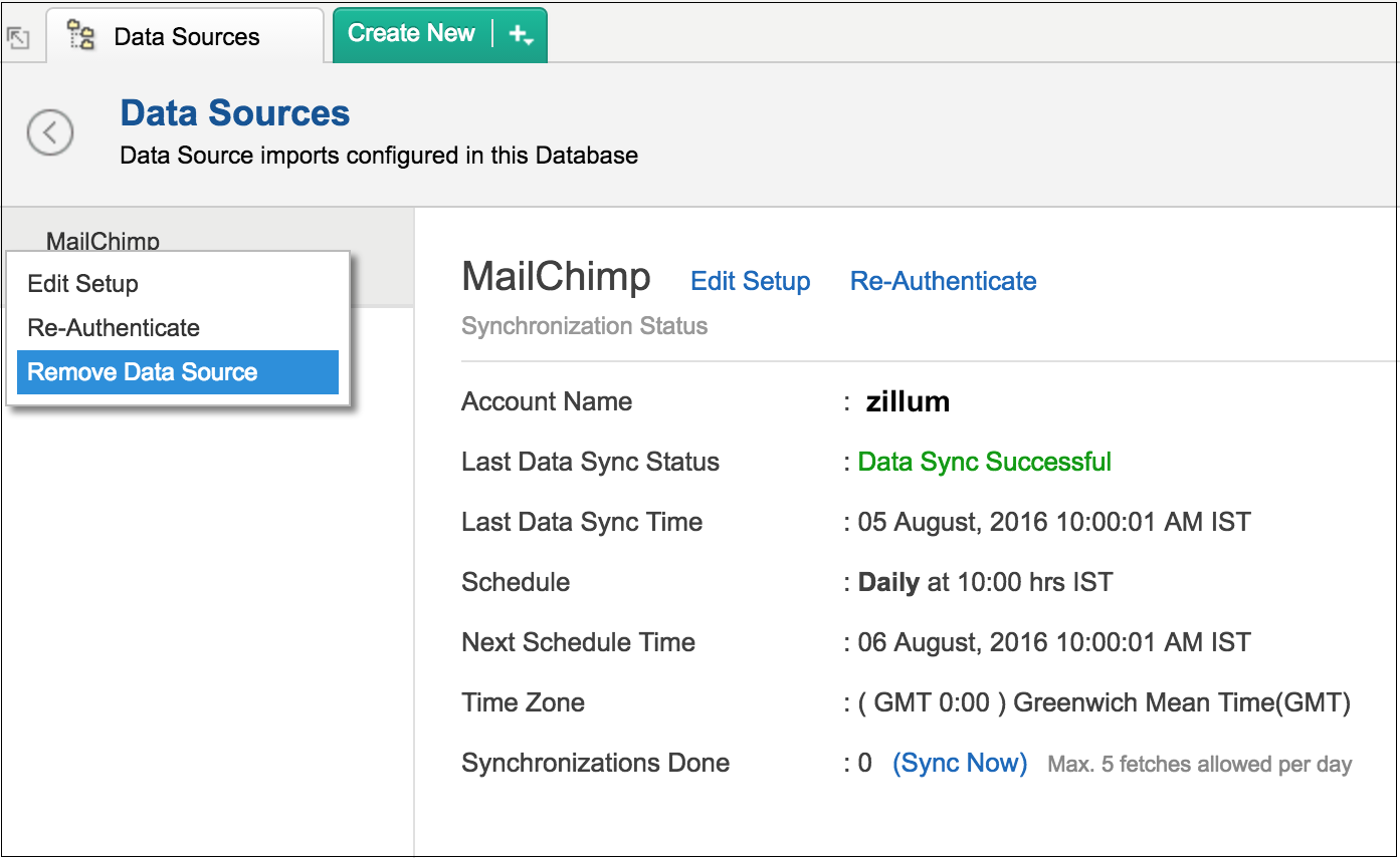 To edit the connection and synchronization settings, select Data Sources -> Mailchimp from the side panel.