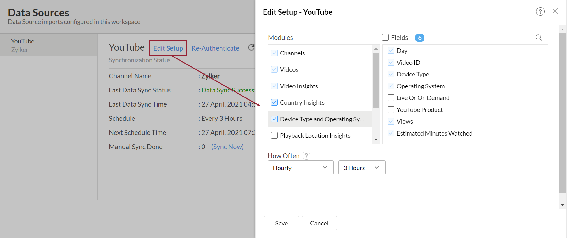 Schedule: The frequency of data synchronization between Zoho Analytics and YouTube.