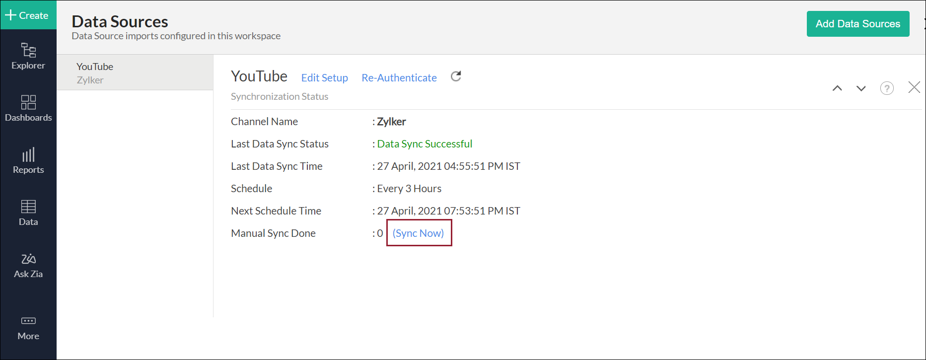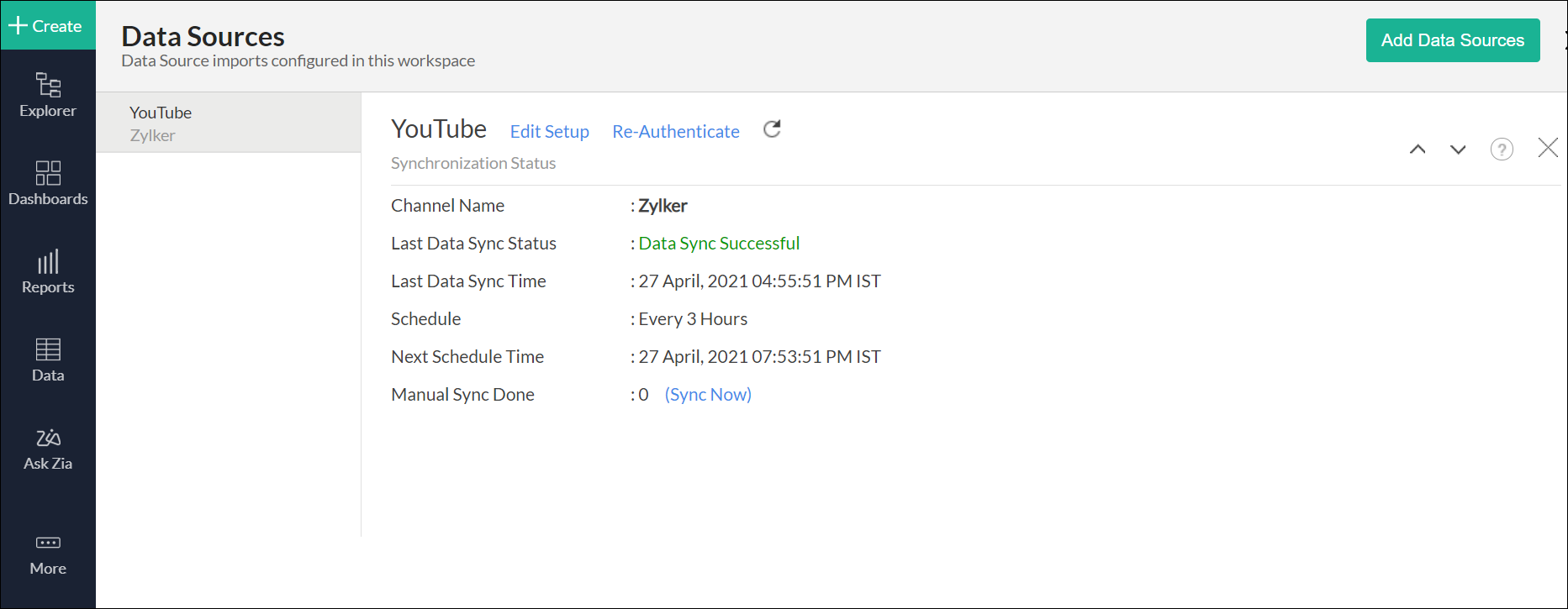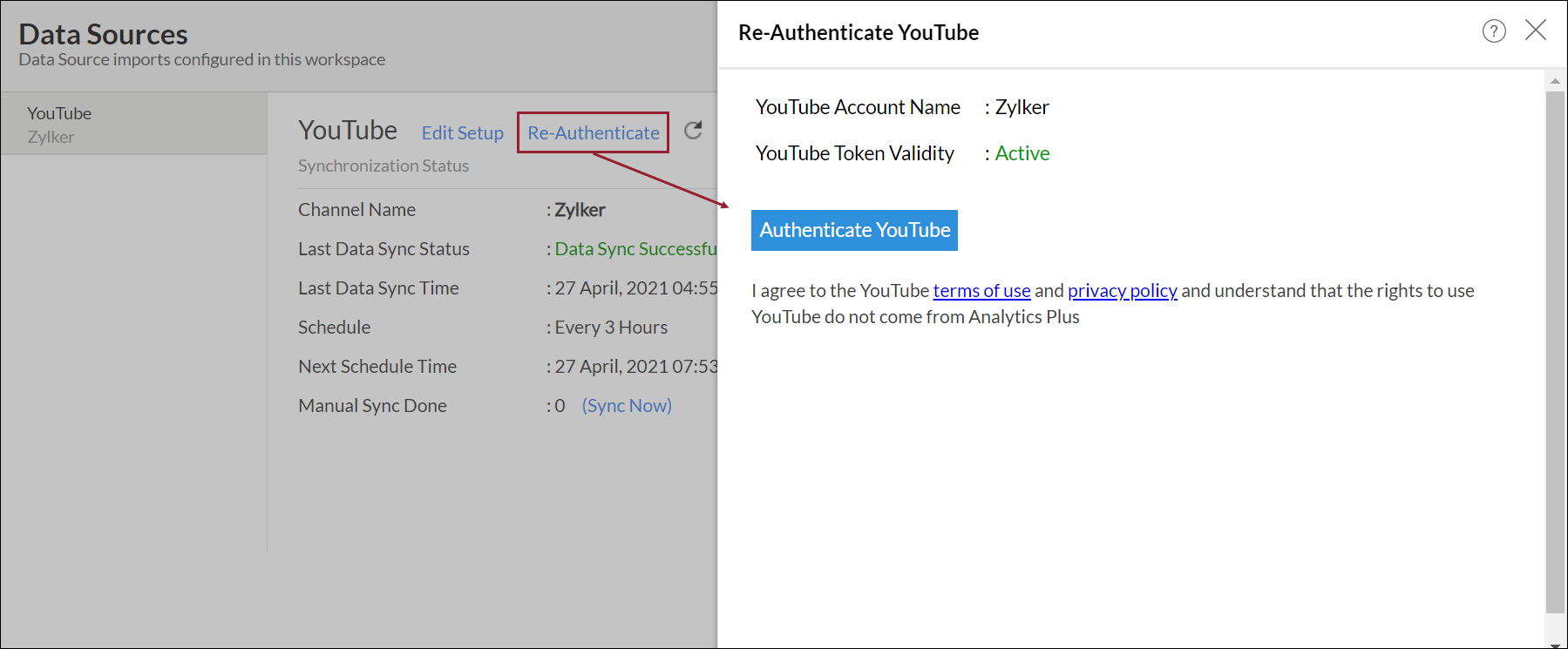 The import or synchronization process of your YouTube data can fail sometimes, due to a variety of reasons. To resolve this, click the Data Sources option from the side panel and click the Re-Authenticate link. In the popup that appears, click Authenticate YouTube. Enter the client ID and client secret, and click the Authenticate YouTube button.