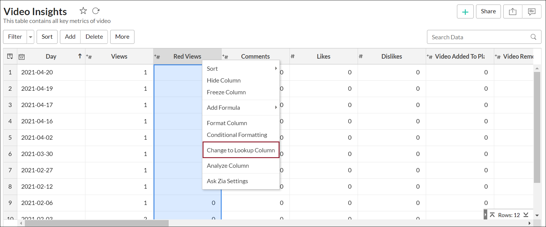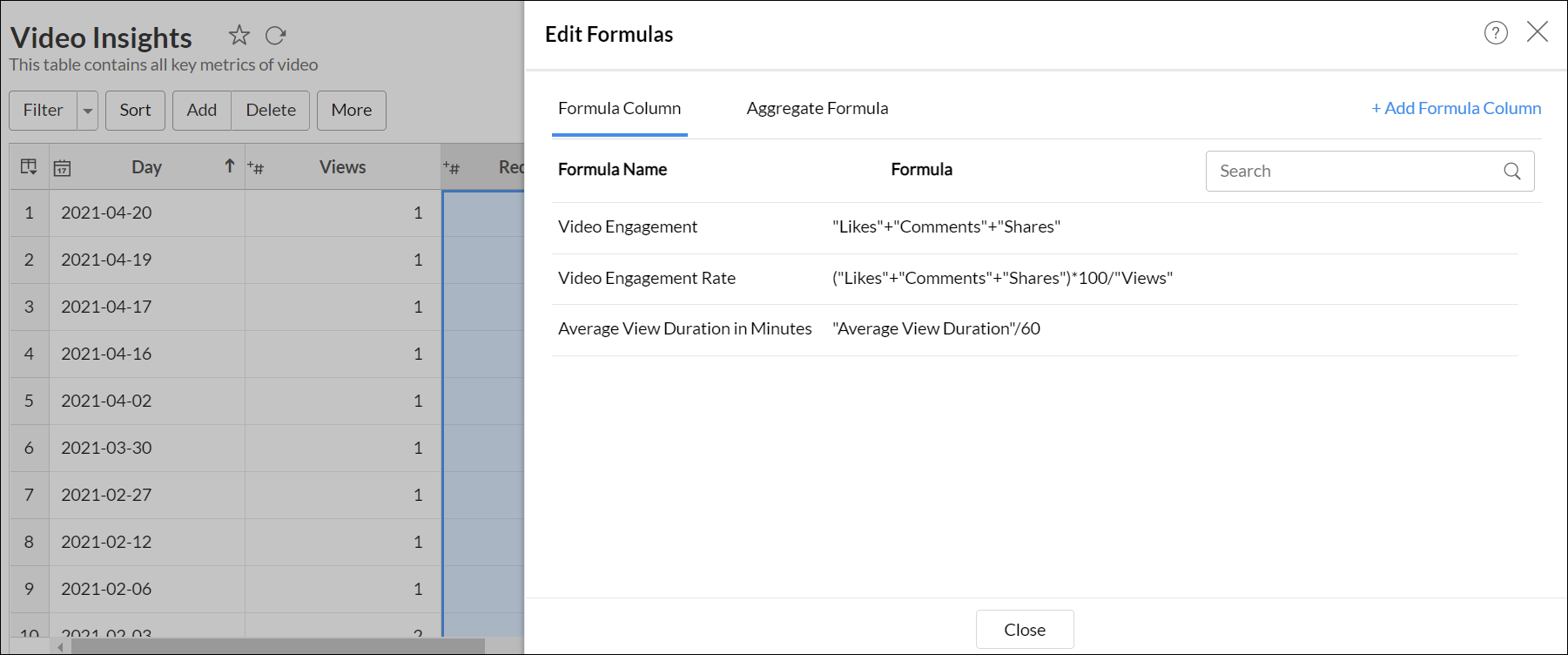 Formulas are calculations that can be defined using the powerful formula engine in Zoho Analytics, to create required reports. Refer this documentation to know more. There are also several default formulas created based on the YouTube modules. To view the default formulas, open the required table, click Add and select the Edit Formulas option.