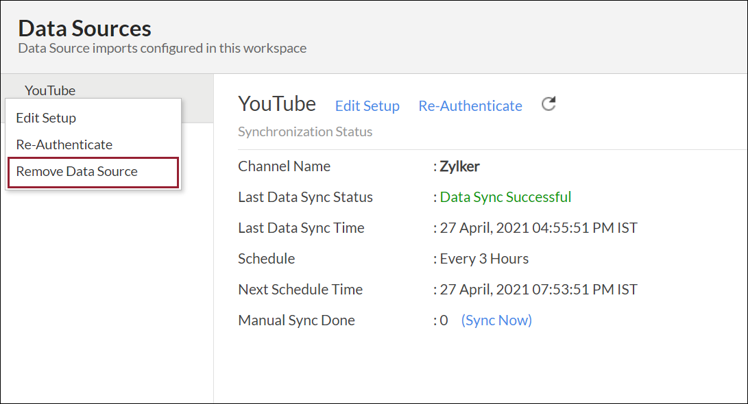 To edit the connection and synchronization settings, select Data Sources -> YouTube from the side panel.