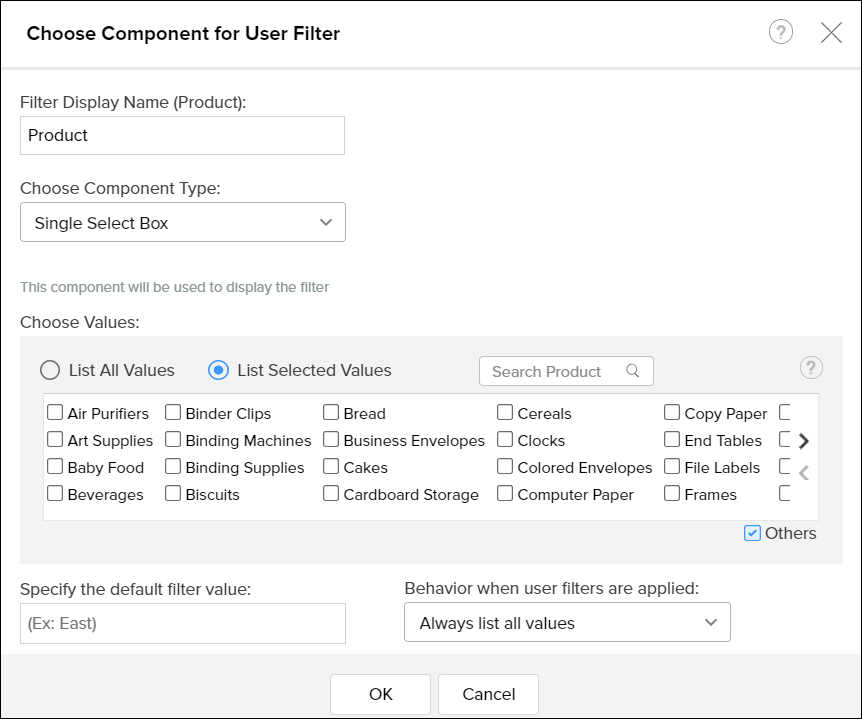 Select the values to be listed by ticking the check box next to each value. Choose Other option to add an items "Others" to the User filter list, to display data corresponding to all other remaining values that are not listed in the user filter drop down, when a user selects it. Select the value List only relevant values for the option Behavior when user filters are applied to set up cascading user filters i.e., the list of values available in one User Filter depends on the value that you have chosen in the preceding User Filter(s).