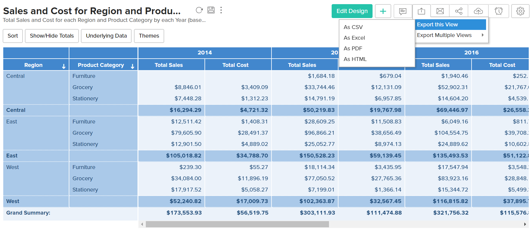Zoho Analytics allows you to export Pivot table that you have created into various file formats like CSV, PDF, XLS and HTML.