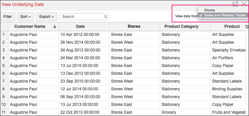 The below example shows the View Underlying Data table of a report that was created by joining the Sales table and the Stores table. By default the option Sales and Related Tables will be selected. This option will display the data from both Sales and Stores in a single table. However if you wish to view the data only from the Stores table you can do so by selecting Stores from the View Data From dropdown.