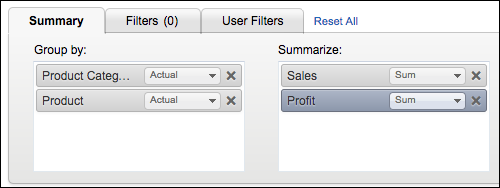 Summary View provides dynamic filtering capabilities in View Mode called User Filters. This enables the users who view the report to apply filters dynamically.