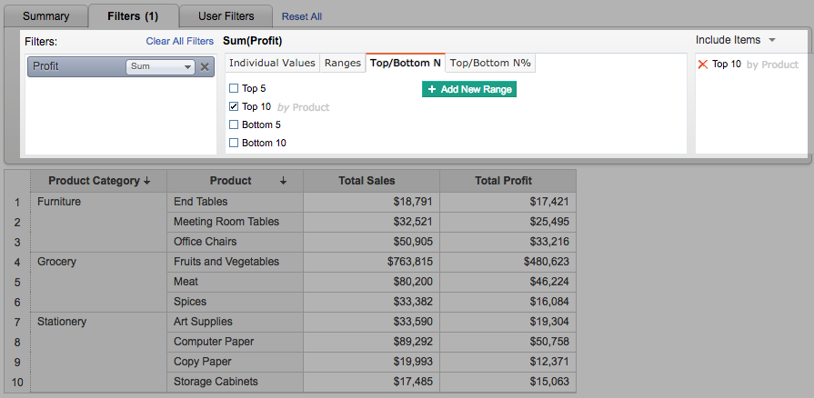 Continuing with the example - we will be filtering the report based on profit. Drop the Profit column and select Top 10 by Product.