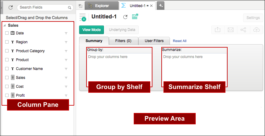 You should drag and drop the required columns listed in the column list pane into the respective shelves in order to create a summary view. You can also select the check box adjacent to each column listed to auto place the columns into the appropriate shelves.