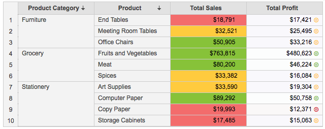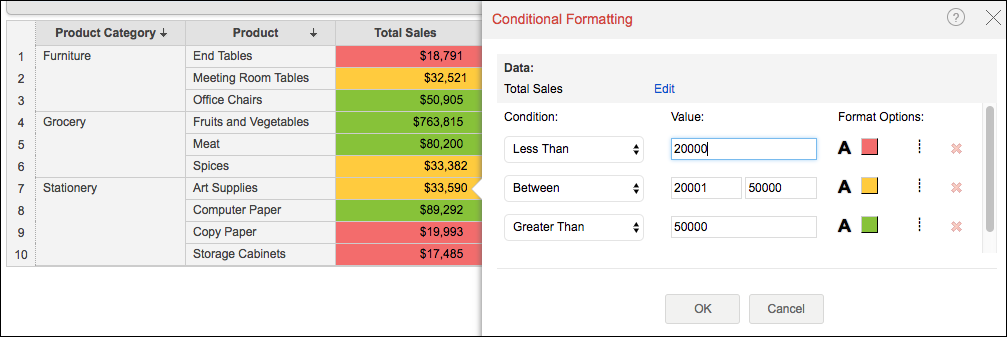 Conditional formatting feature allows you to visually highlight data cells in a Summary View with different styles based on matching conditions. You have to specify the required conditions/criteria for formatting. The condition that matches first with the data cell will be applied.