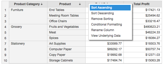 - Sort Ascending - Sorts text data in ascending alphabetical order (A to Z), numbers from smallest to largest (0-9), and dates from oldest to latest.