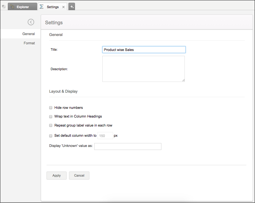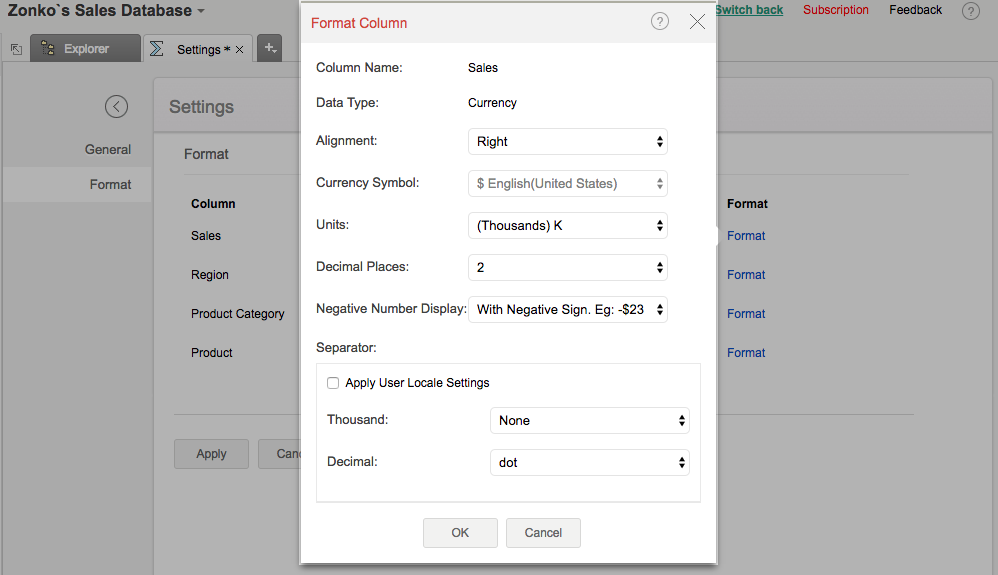 - You can set the display format of each column clicking the Format link. The options in the Format column dialog will vary depending the data type of the column. These options will be similar to that of the table column formatting options in Tables. For more details refer here.